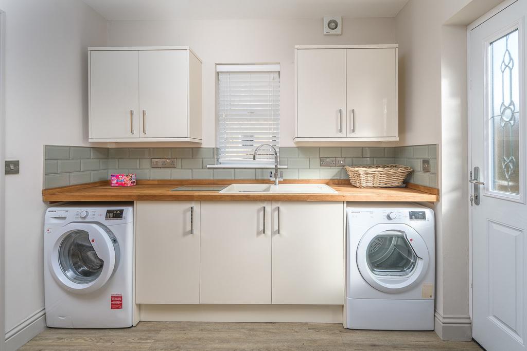 An oak door opens into a beneficial utility room which offers a single bowl acrylic sink, space and plumbing for a washing machine and space for a tumble dryer. There are further wall and base units with a lighter coloured door complemented by a beech block wood effect work surface with a green splash back tile surround. A uPVC door provides external access.