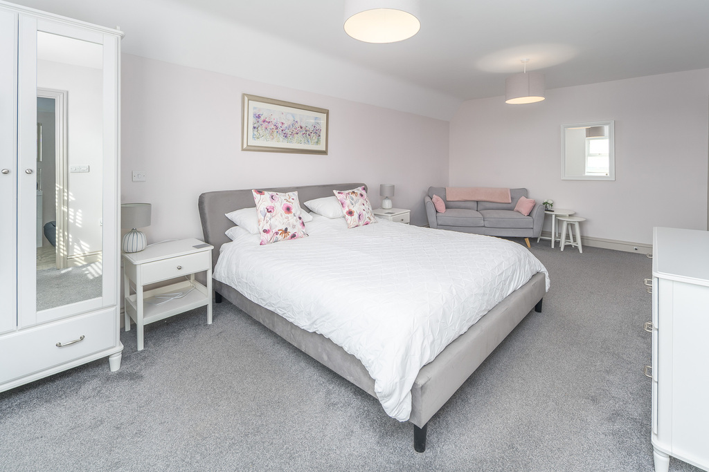The primary bedroom is a super king room which incorporates the chimney breast and features a coombed ceiling which adds character. There are plenty of storage options available within this light and bright room which captures views to the front of the property. The en-suite comprises a good-sized shower cubicle with wet walling and a water fall shower head and separate shower head within, a vanity unit with a hand wash basin on top and a concealed cistern toilet within a unit with a push button behind. A chrome heated towel rail ensures added comfort and natural light enters via a window with privacy glass.