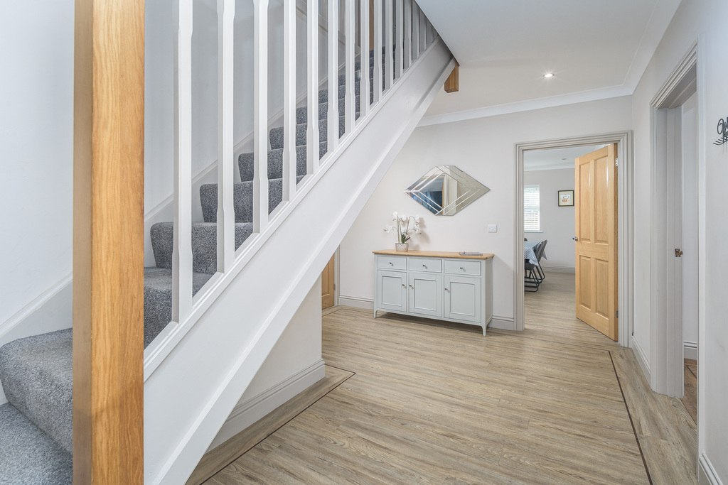 A modern built home located on the former school field, this lovely property is delightfully well presented and offers spacious contemporary light and bright living. You are welcomed by an attractive light and bright stone-fronted porch with bench seating which is ideal for taking shoes off after returning from exploring the beautiful countryside. The composite front door opens into the main L shaped hallway, with Karndean flooring, providing convenient access to the main living spaces and with stairs ascending to the first floor.