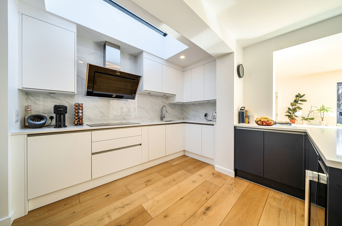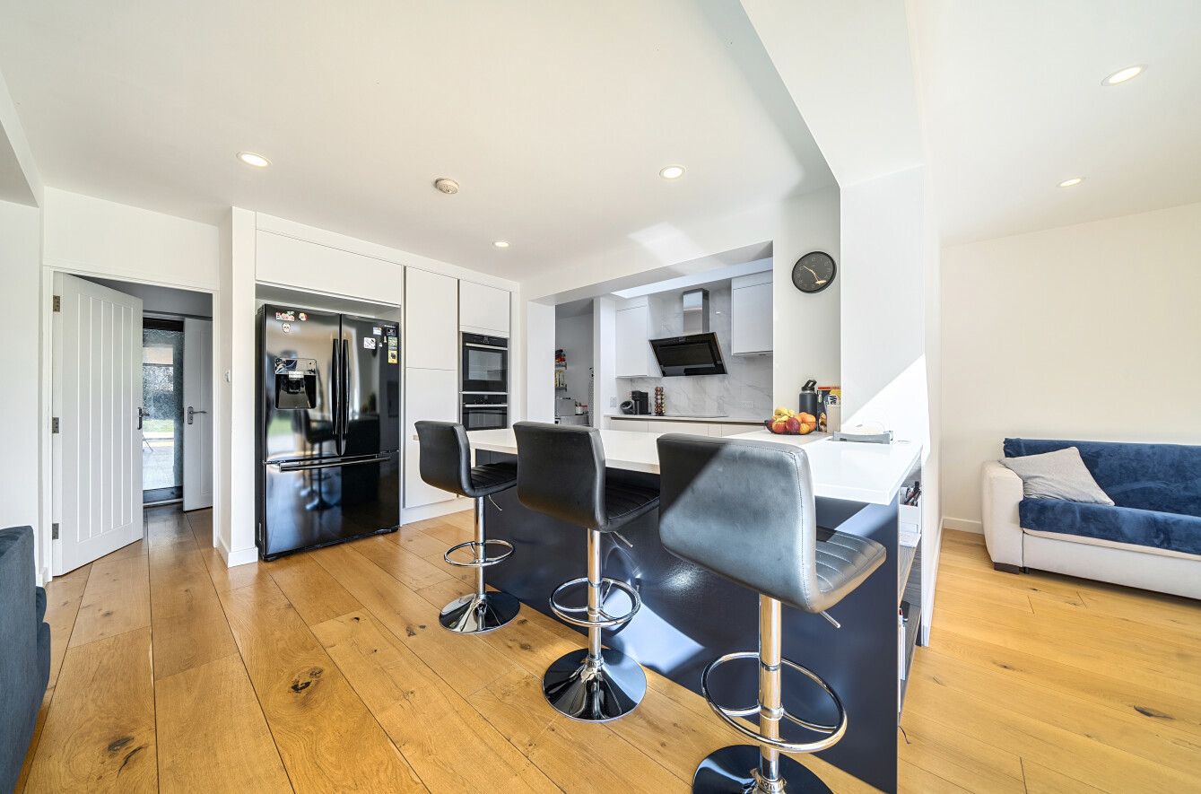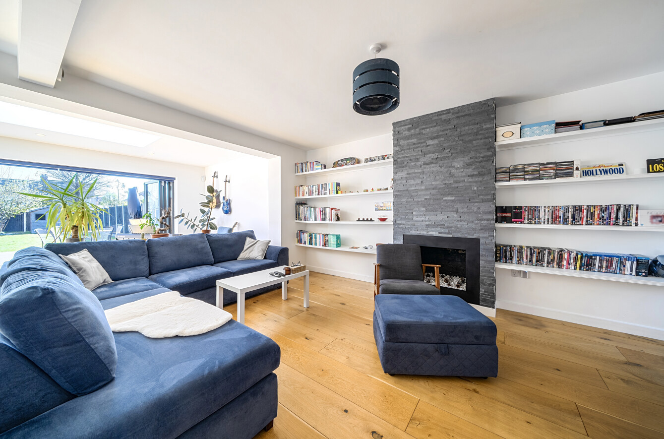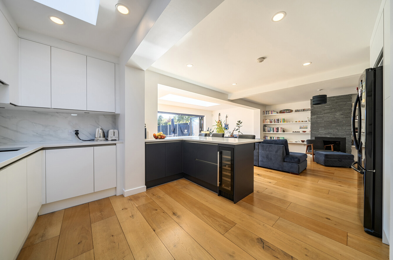 The main reception/kitchen space is open plan but divided into three distinct areas – The living space is spacious with ample space for comfy seating and has a fireplace as a focal point with display shelving either side. The kitchen is fitted with a good range of contrasting wall and base units topped with a granite worktop. There is a wine cooler and integrated appliances, including a Bosch dishwasher, microwave, oven, induction hob with angled cooker hood and American style fridge/freezer. In a separate utility room there is space and plumbing for a washing machine and tumble dryer. Finally, the dining area to the rear has bi-fold doors providing direct access and a nice outlook over the garden.