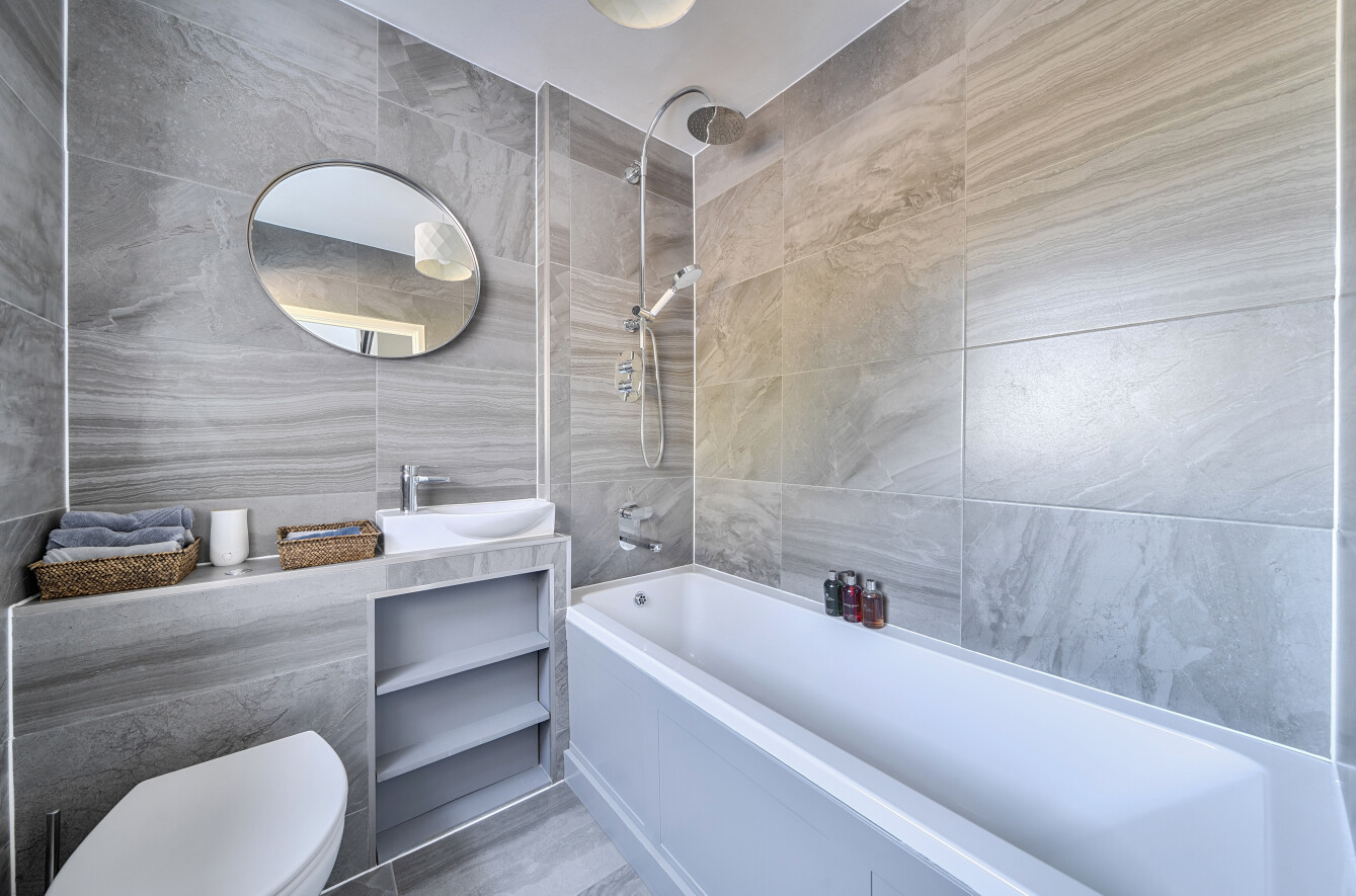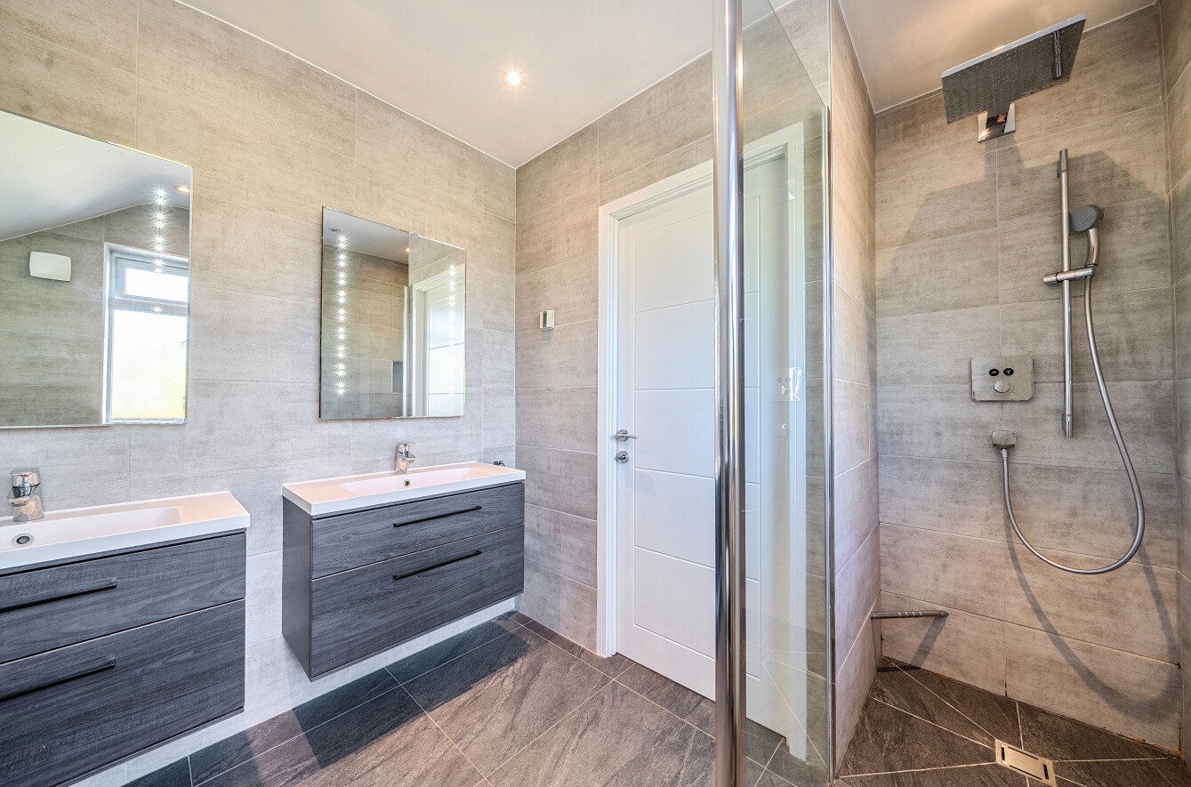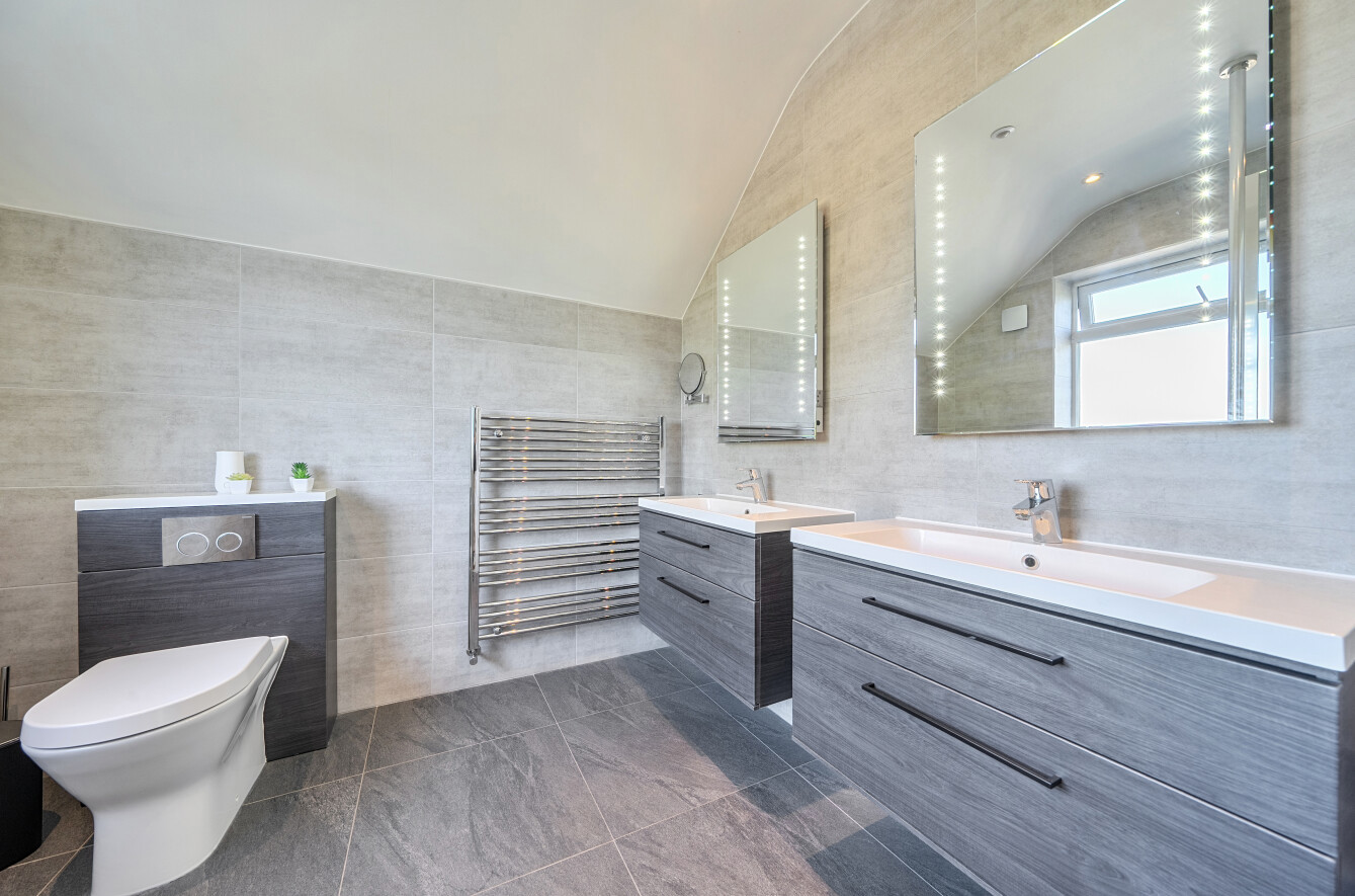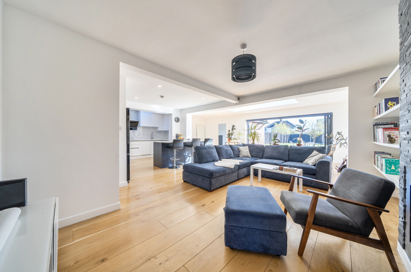 The main reception/kitchen space is open plan but divided into three distinct areas – The living space is spacious with ample space for comfy seating and has a fireplace as a focal point with display shelving either side. The kitchen is fitted with a good range of contrasting wall and base units topped with a granite worktop. There is a wine cooler and integrated appliances, including a Bosch dishwasher, microwave, oven, induction hob with angled cooker hood and American style fridge/freezer. In a separate utility room there is space and plumbing for a washing machine and tumble dryer. Finally, the dining area to the rear has bi-fold doors providing direct access and a nice outlook over the garden.