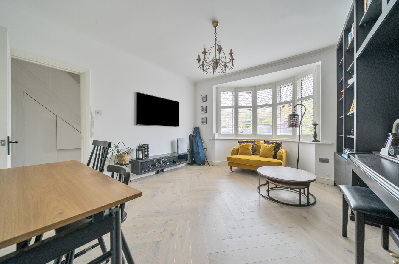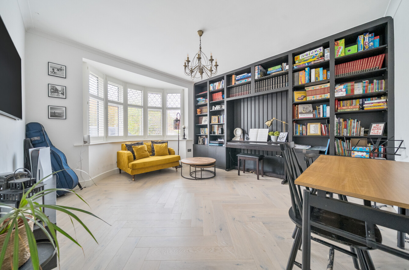 At the front of the property are two reception rooms. The living room features a bay window and built-in bookcases with a handy desk area. The second room offers great flexibility and could be used as a TV snug, playroom, or study depending on your lifestyle.