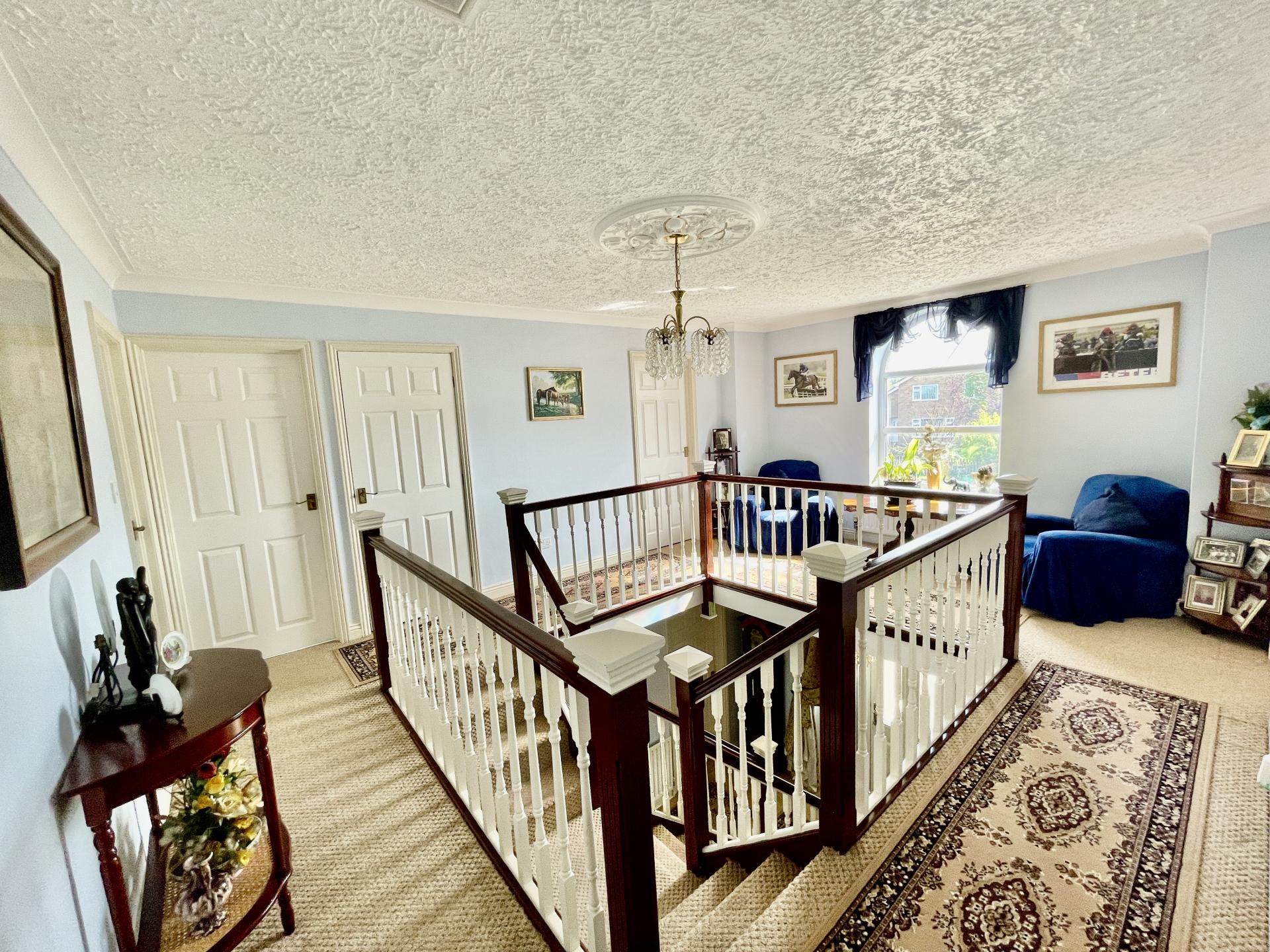GALLERIED FIRST FLOOR LANDING 13' 4" x 17' 8" (4.08m x 5.41m) Decorative ceiling rose with pendant light fitment, coved and textured ceiling, access to loft space, radiator, fitted carpet, dome topped window to the front elevation, fitted Airing Cupboard, doors arranged off to: