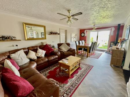 DINING/FAMILY ROOM 22' 3" x 11' 11" (6.80m x 3.64m) 2 ceiling lights with propeller style fans, 2 radiators, coved and textured ceiling, corner fitted log burner, UPVC sliding patio doors to the rear elevation, arch to Kitchen, door to: