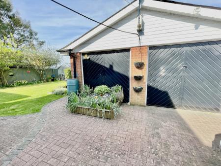 DETACHED DOUBLE GARAGE 18' 4" x 18' 2" (5.61m x 5.56m) Brick and block construction beneath a pitched tiled felted roof with twin up and over doors, concrete floor, side personnel door, power and lighting and access to: