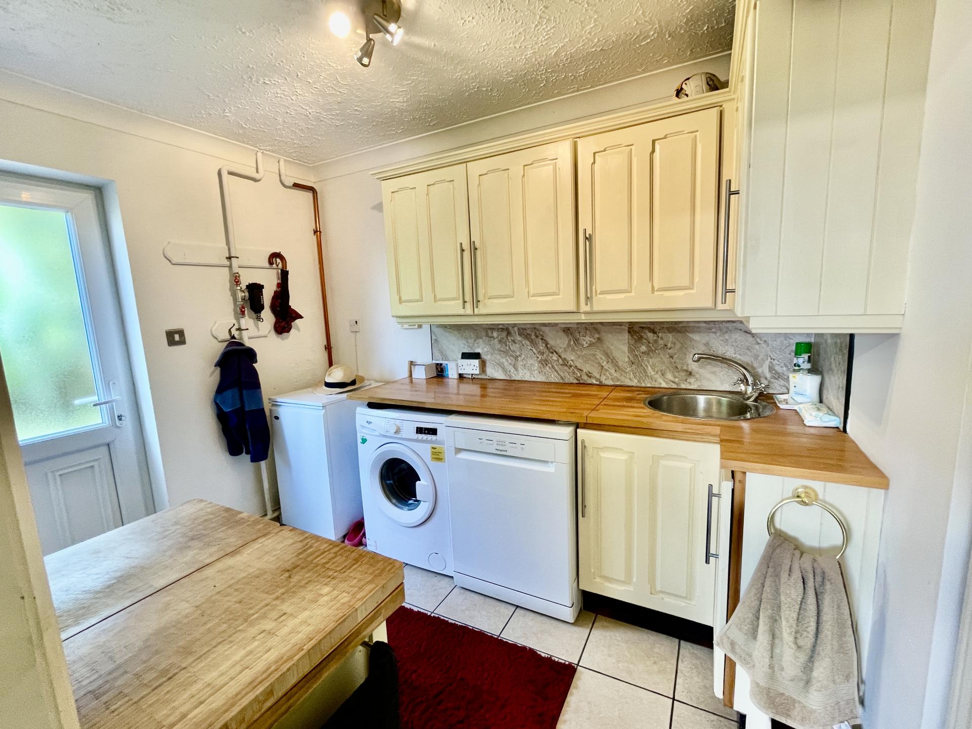 UTILITY ROOM 9' 5" x 7' 0" (2.89m x 2.14m) Tiled floor, worktop with fitted cupboards beneath, circular bowl sink unit with mixer tap, eye level wall cupboards, plumbing and space for washing machine and dishwasher, Grant oil fired central heating boiler (installed December 2023), coved and textured ceiling, ceiling light, part glazed UPVC external entrance door, shelved store cupboard.