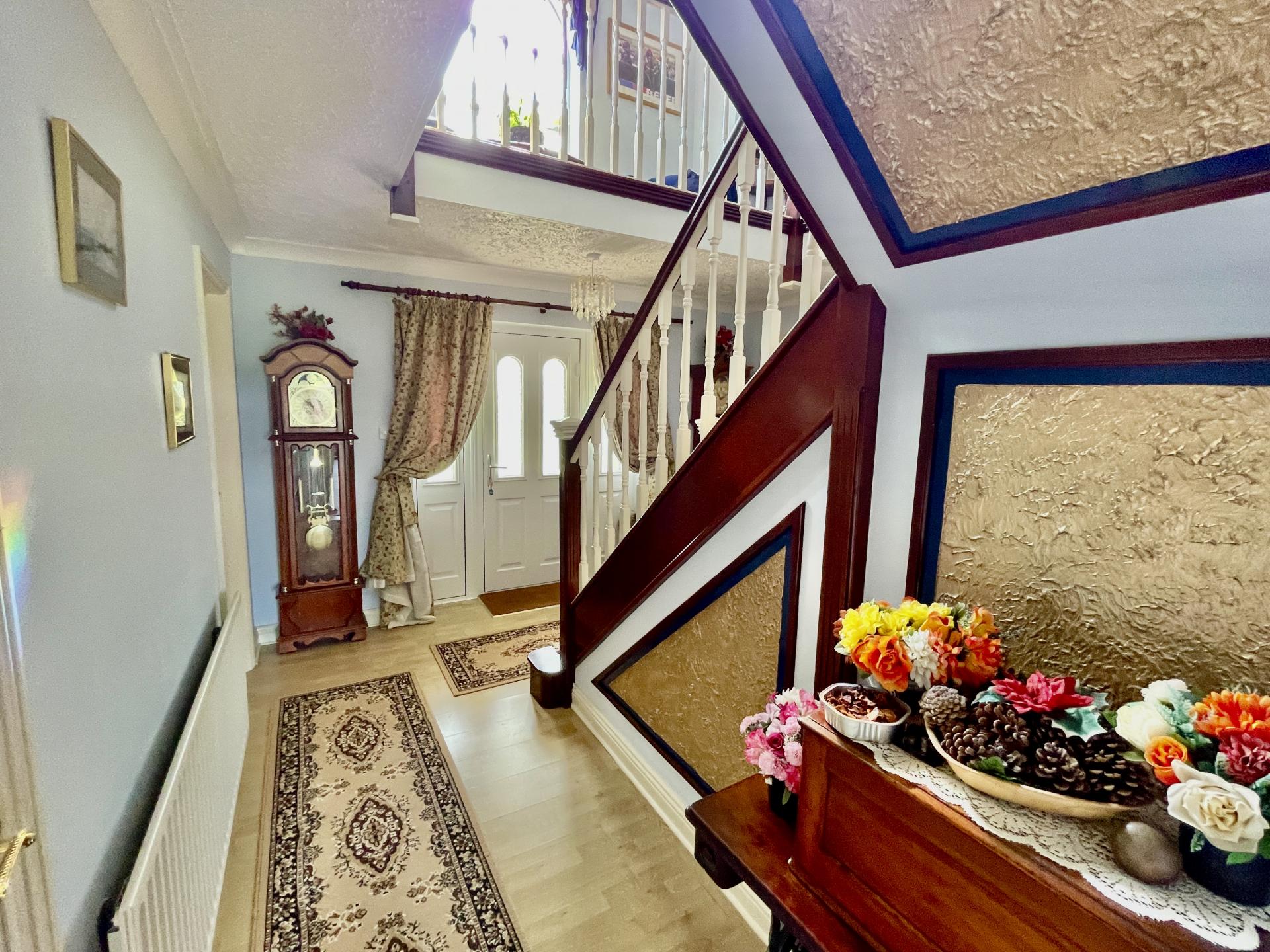 RECEPTION HALL 12' 2" x 12' 6" (3.71m x 3.82m) Stylish central staircase, laminate flooring, coved and textured ceiling, radiator, understairs store cupboard, shelved cloaks cupboard, door to: