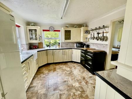 FITTED KITCHEN 10' 11" x 11' 8" (3.33m x 3.58m) Range of fitted units comprising base cupboards and drawers beneath the wood trimmed worktops with integrated splashback, Belfast sink with hot and cold mixer tap, eye level wall cupboards, glazed display cabinet, three quarter height provision cupboard, appliance space, space for multi fuel Range style cooker, dual aspect with UPVC windows to the side and rear elevations, coved and textured ceiling, fluorescent strip light, door to: