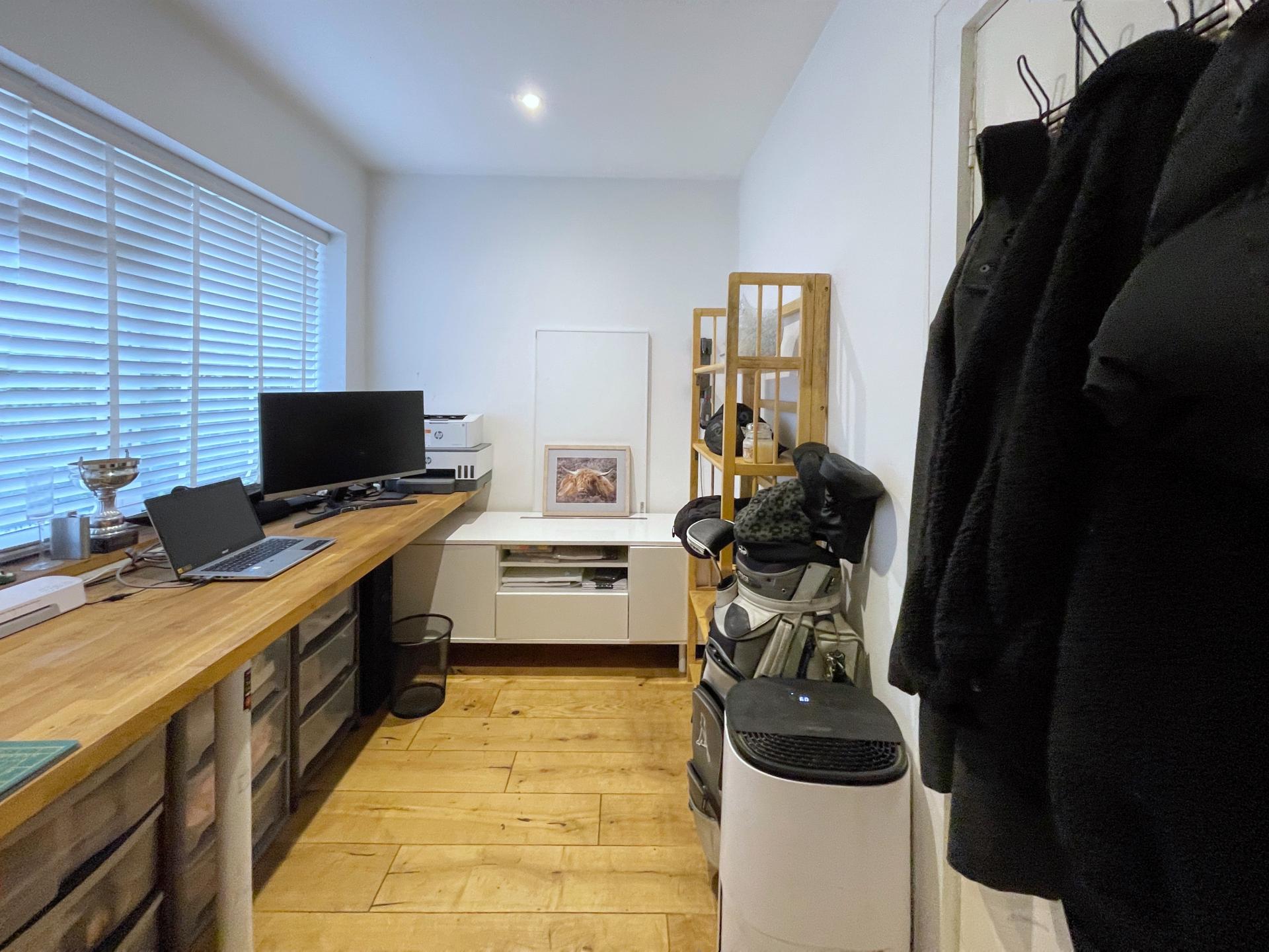 STUDY 6' 6" x 8' 6" (1.99m x 2.61m) UPVC double glazed window to the rear elevation, skimmed ceiling, inset LED lighting, solid oak flooring, solid oak block desk area, door into Garage.