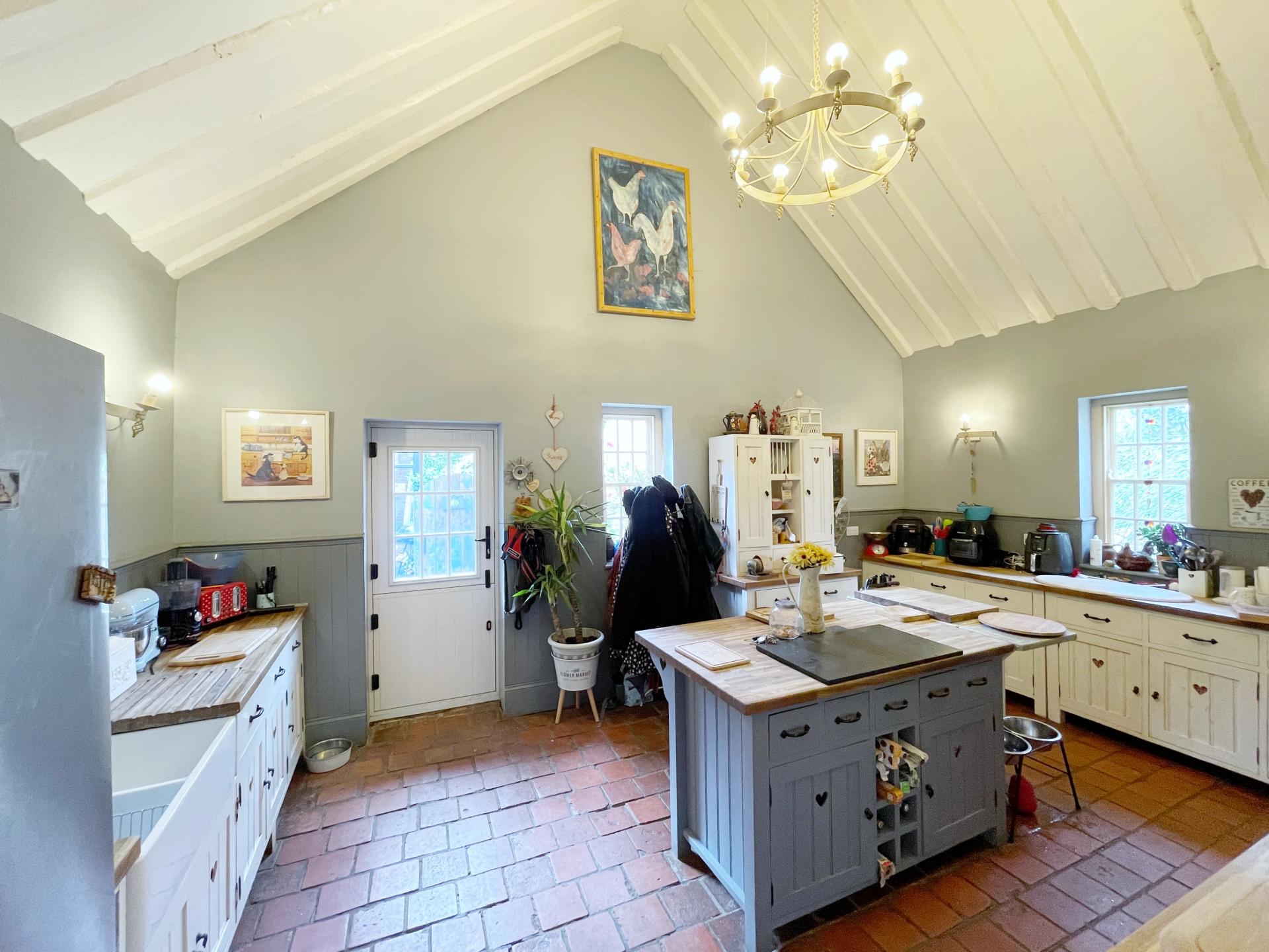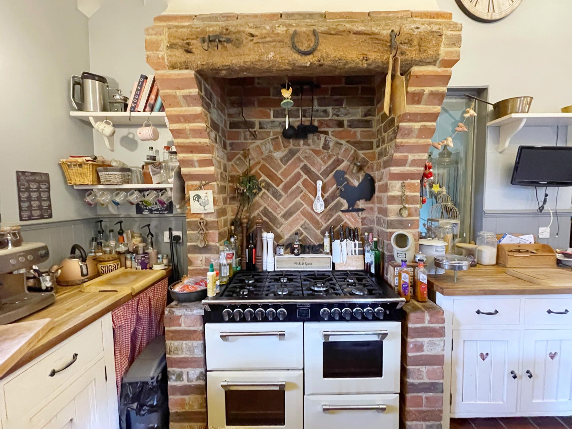 KITCHEN BREAKFAST ROOM 13' 10" x 19' 7" (4.22m x 5.99m) Georgian sash window to the front, side and rear elevations, vaulted beamed ceiling, centre light point, 4 wall lights, original quarry tiled flooring, fitted with a wide range of handmade units with solid oak wood worktops, inglenook fireplace with beam, Rangemaster cooker with gas propane 7 ring hob and electric oven, double enamel sink with mixer tap, part wood panelling to the walls, TV point, glazed door leading into Lounge. Square arch into:
