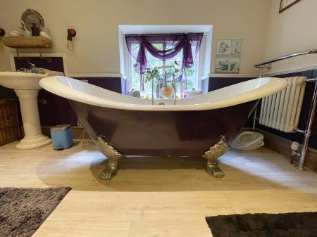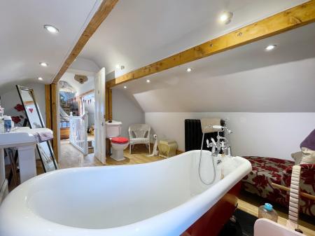EN-SUITE 11' 3" x 13' 10" (3.43m x 4.24m) Wooden glazed window to the side elevation, skimmed ceiling, 4 wall lights, oak fitted flooring, feature wooden fireplace with tiled inserts, fitted with a three piece suite comprising low level WC, pedestal wash hand basin with taps, roll top bath with claw feet with fitted telephone shower mixer tap.