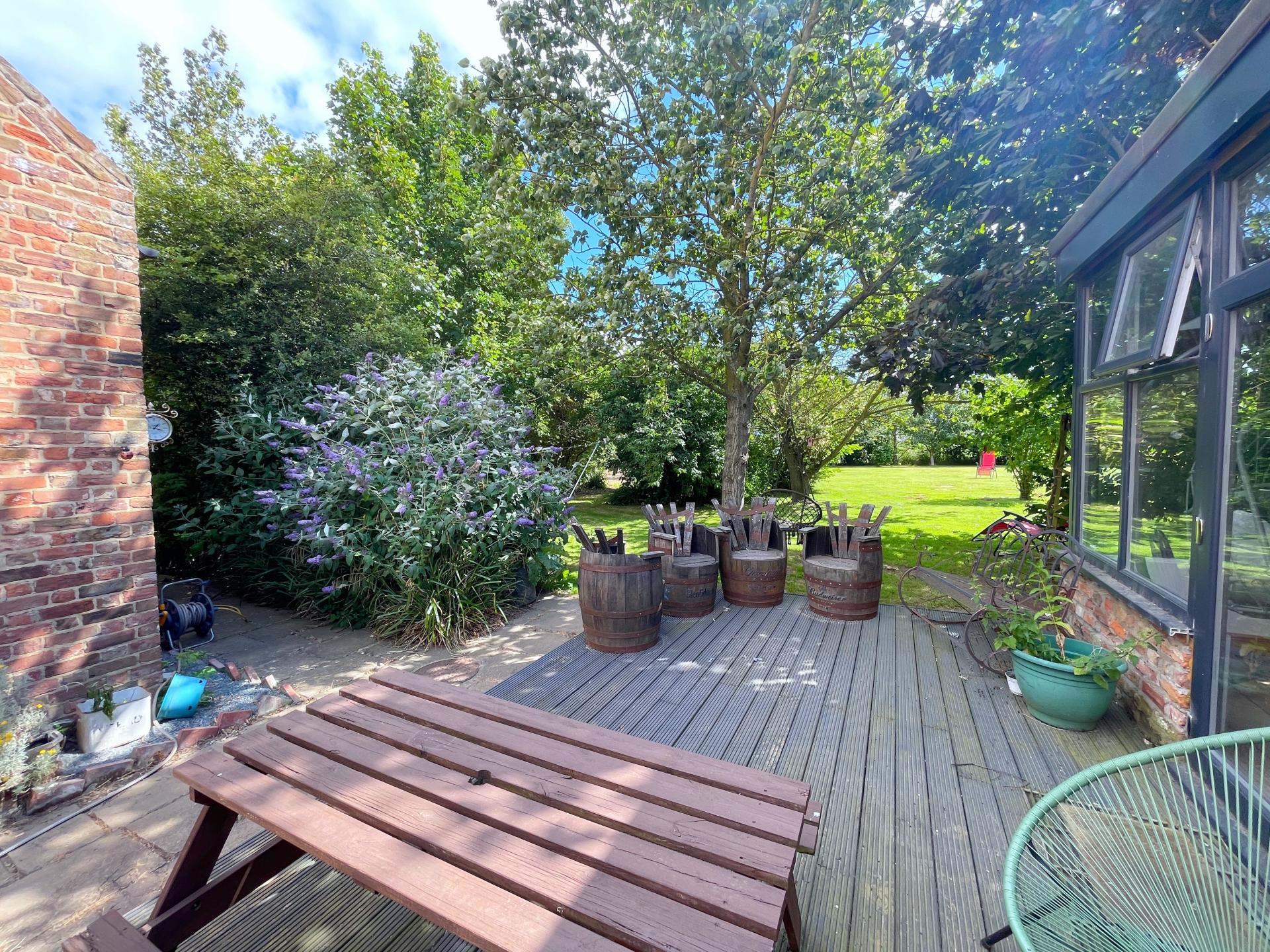 To the side there is paved pathways, patio/seating area, gate leading into rear gardens.