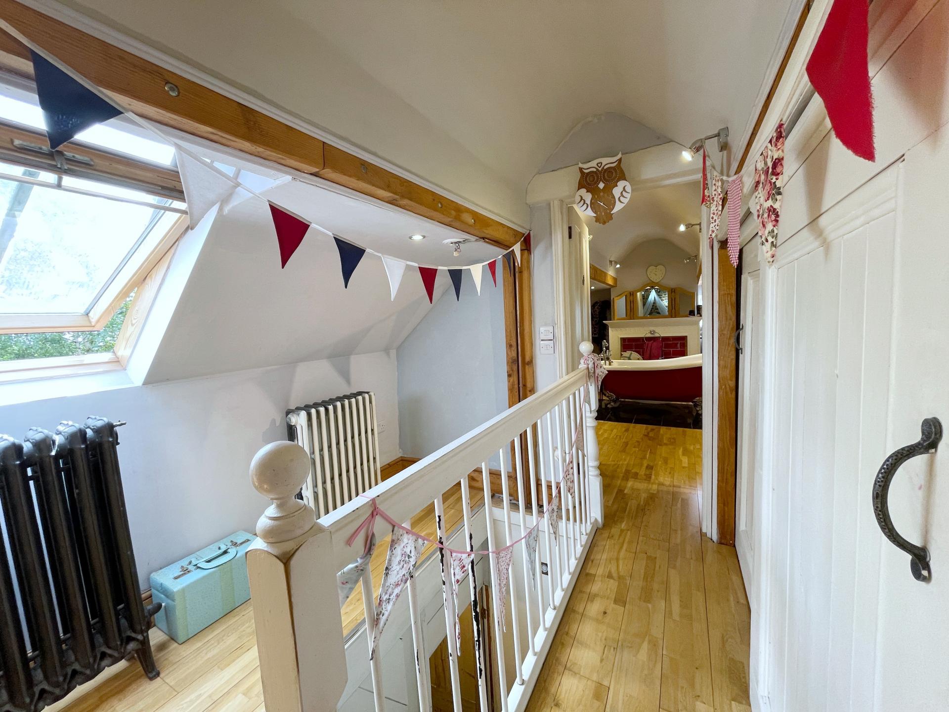 FAMILY BATHROOM 7' 11" x 15' 3" (2.42m x 4.65m) Wooden glazed window to the rear elevation, skimmed ceiling, inset LED lighting, extractor fan, loft access, 4 wall lights, 2 original school radiators, heated towel rail, oak effect flooring, part wood panelling to the walls, extractor fan, fitted with a four piece suite comprising low level WC with taps, shower and mirror over, roll top bath with claw feet with fitted telephone shower mixer tap, high rise WC, built-in double shower enclosure with fitted thermostatic shower. Storage cupboard off housing heating controls and hot water cylinder.