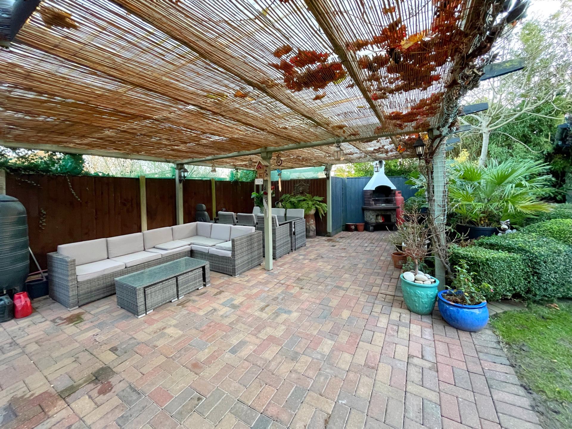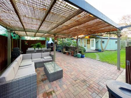 COVERED ENTERTAINING AREA 20' 6" x 16' 8" (6.26m x 5.10m) Block paved with a painted wooden framework and perspex roof over bamboo with multiple seating area, barbeque with canopied hood and under storage.