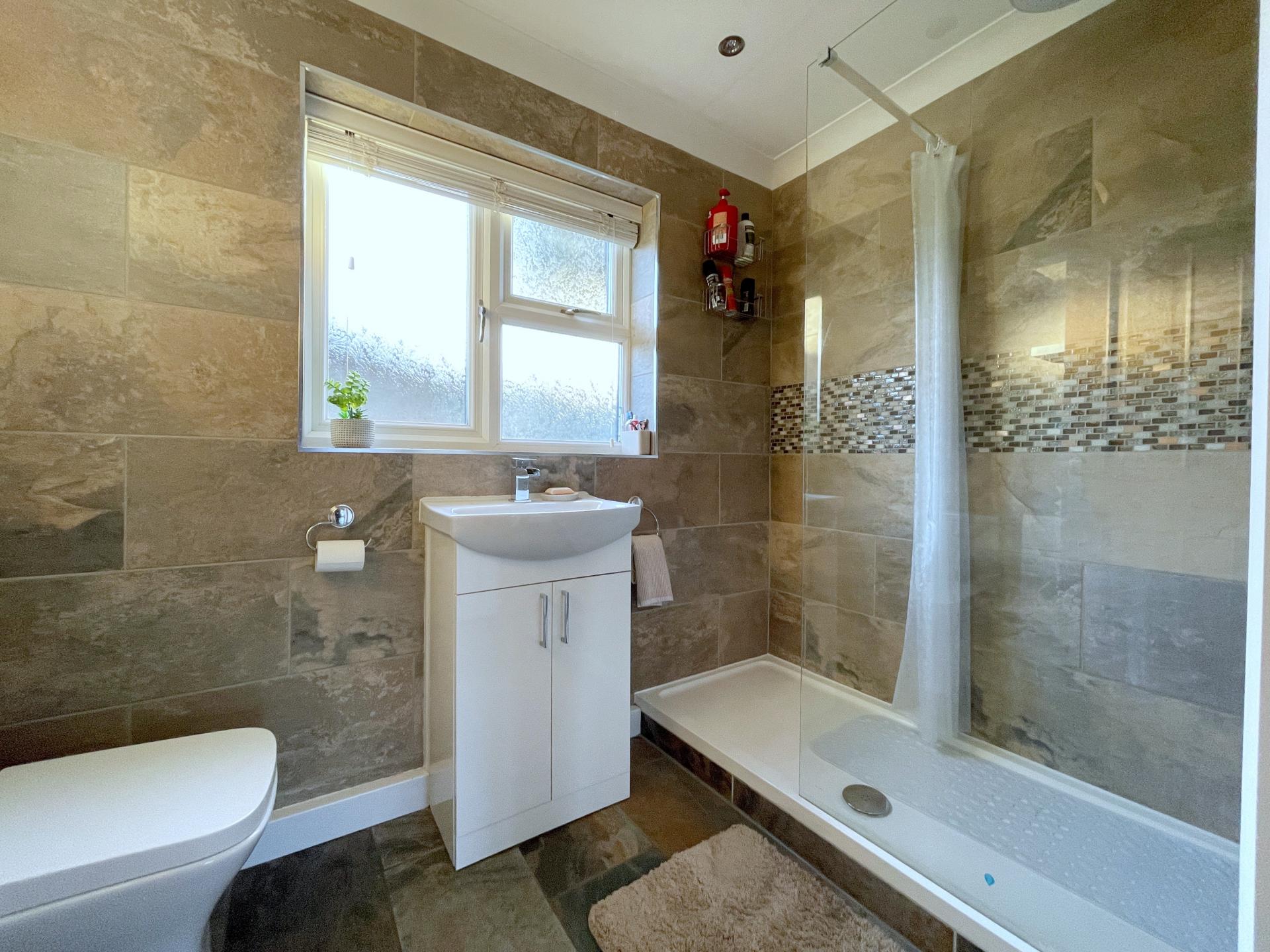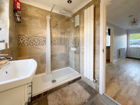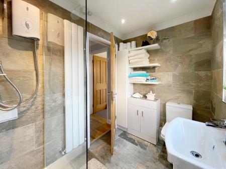 SHOWER ROOM 5' 7" x 8' 0" (1.71m x 2.45m) 1700mm shower tray with fixed screen, Mira Sport electric shower with overhead rainwater sprinkler, wash hand basin with mixer tap and storage unit beneath, low level WC, fitted store cabinet and three quarter height shelved medicine cabinet, modern tiled walls and floor, contemporary vertical radiator, recessed ceiling lights.