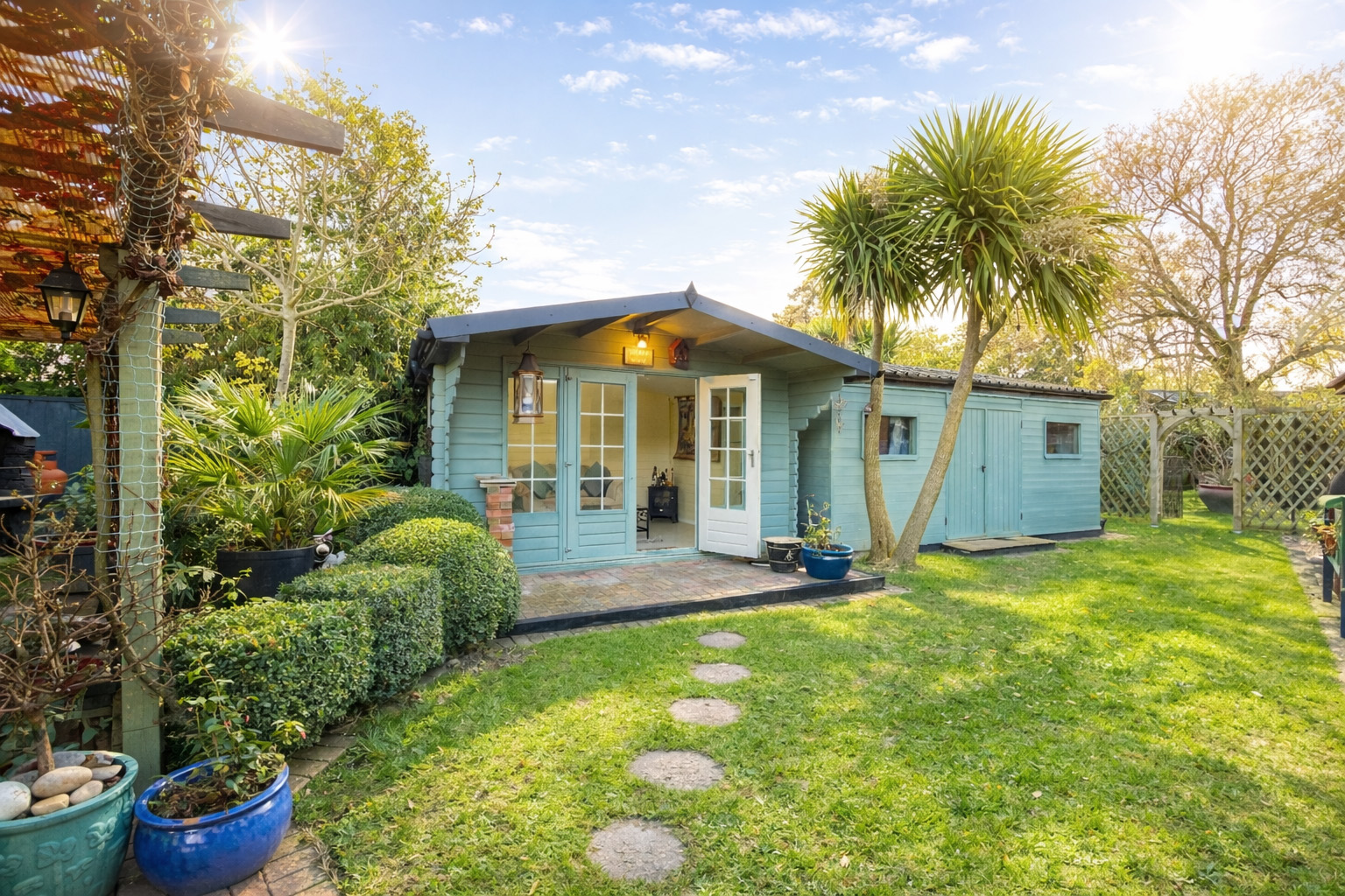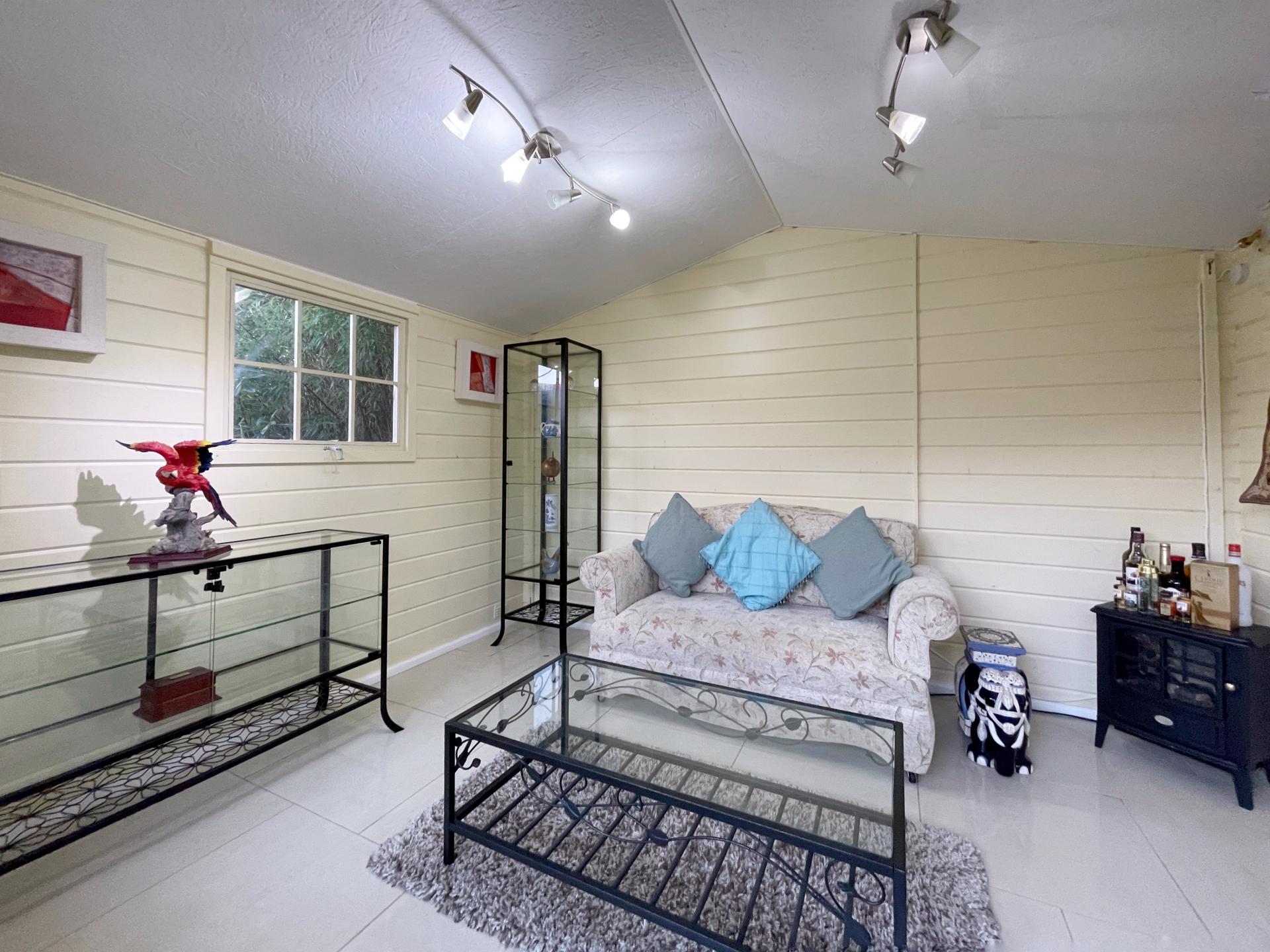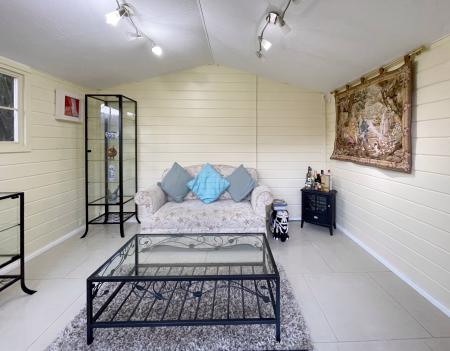 SUMMERHOUSE/GARDEN OFFICE 9' 2" x 11' 7" (2.80m x 3.55m) Painted timber with power and lighting, twin glazed entrance doors, block paved plinth.