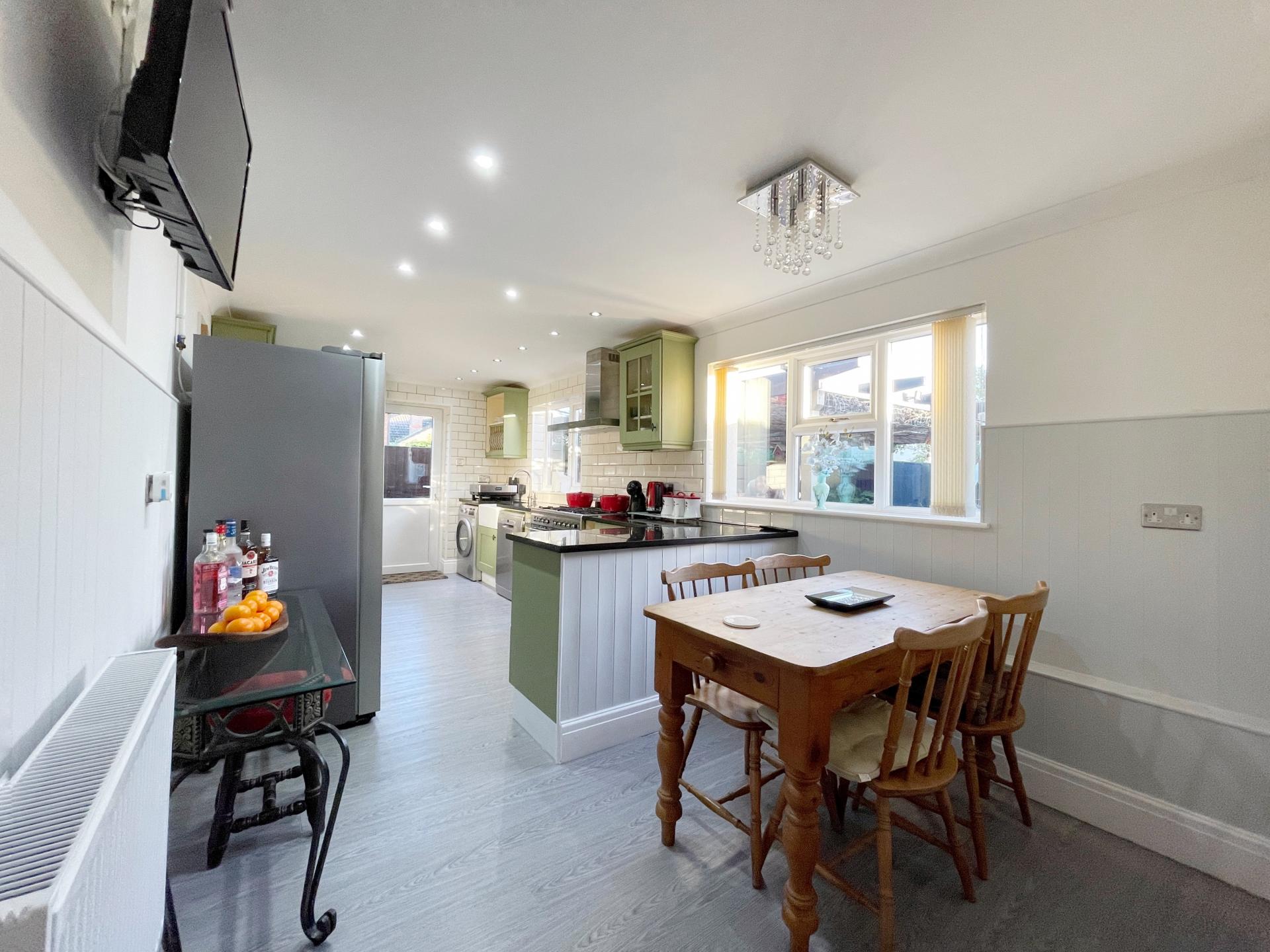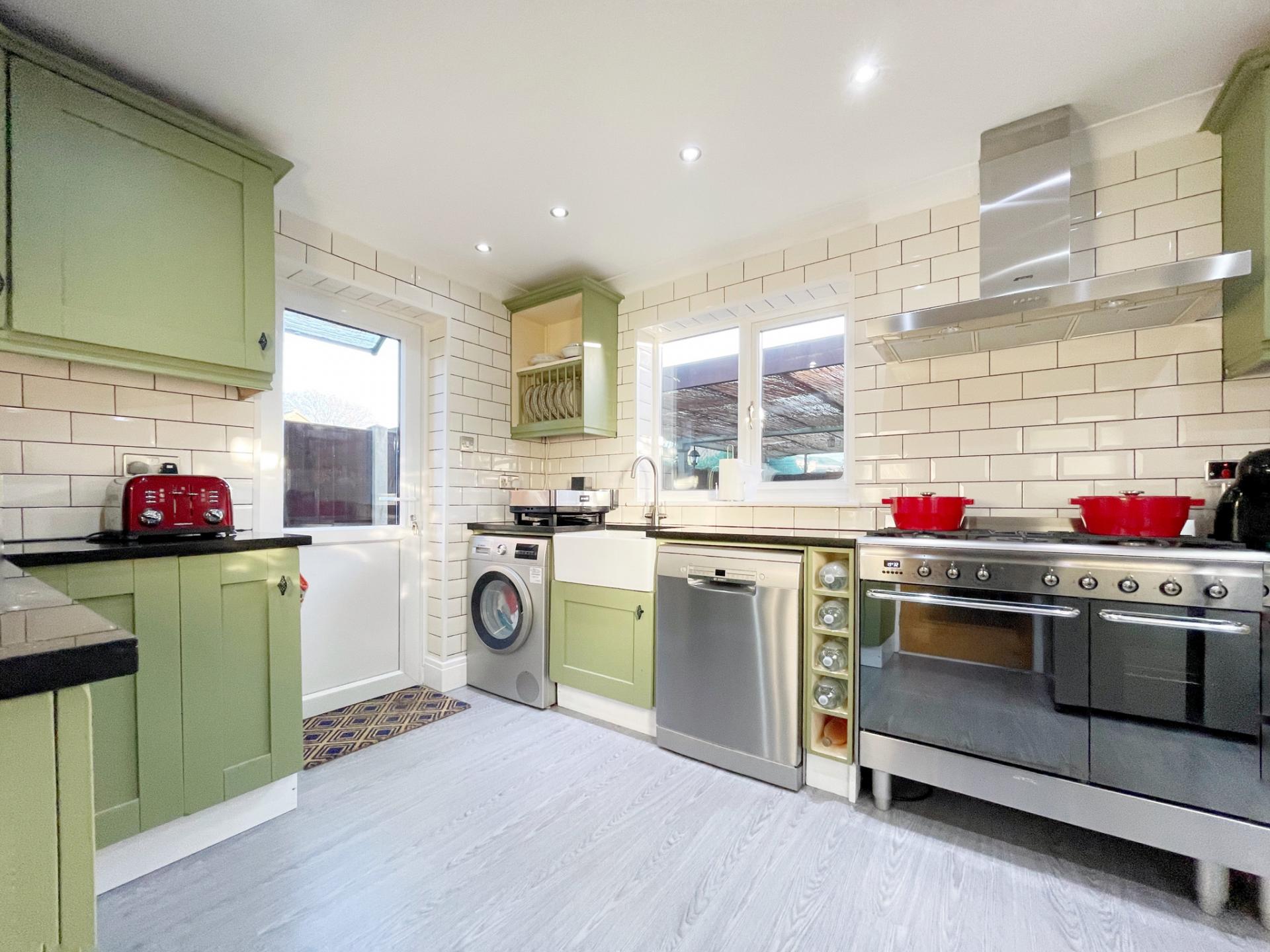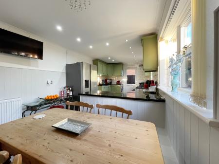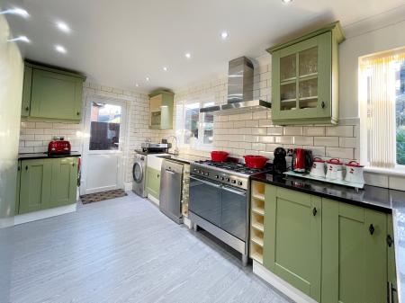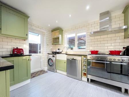 FITTED BREAKFAST KITCHEN 21' 7" x 9' 3" (6.58m x 2.83m) Contemporary green solid oak units including base cupboards and drawers, granite effect worktops, glazed display cabinet, wall units, plate rack, Metro style tiling, plumbing and space for dishwasher, twin wine racks, space for Range style cooker with Smeg multi speed canopy cooker hood above, 2 UPVC windows to the rear elevation, half glazed UPVC external entrance door, feature half height panelling around the breakfast area, radiator, plumbing and space for washing machine, Belfast sink with mixer tap, door to:
