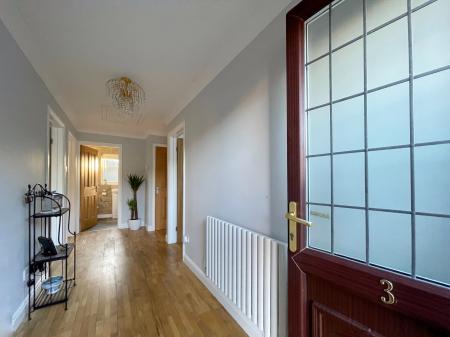 RECEPTION HALL 17' 2" x 5' 1" (5.25m x 1.55m) Part leaded light glazed UPVC front entrance door with similar side panel, wood grain effect flooring, contemporary radiator, access to loft space, coved cornice, built-in linen cupboard, doors arranged off to: