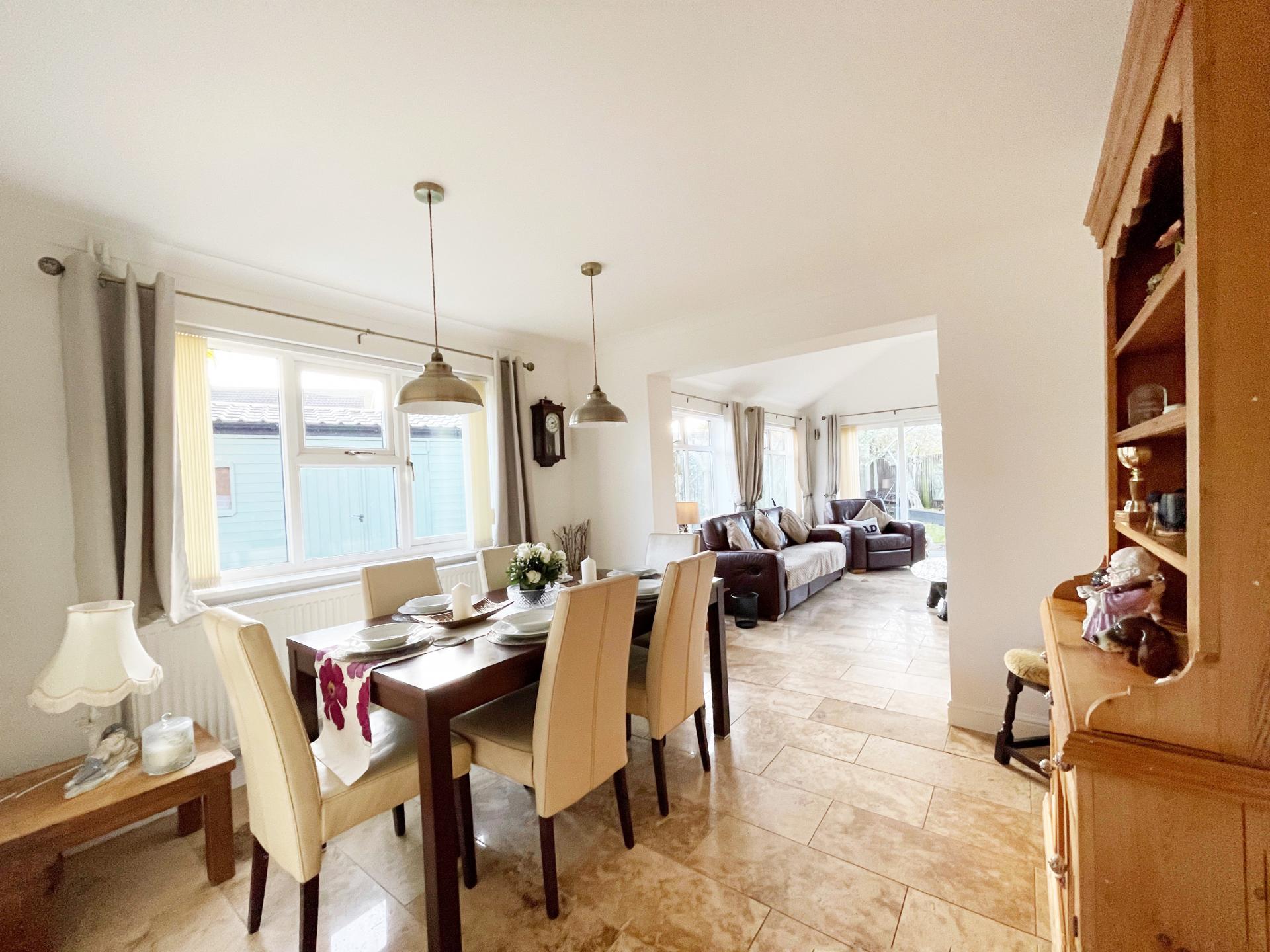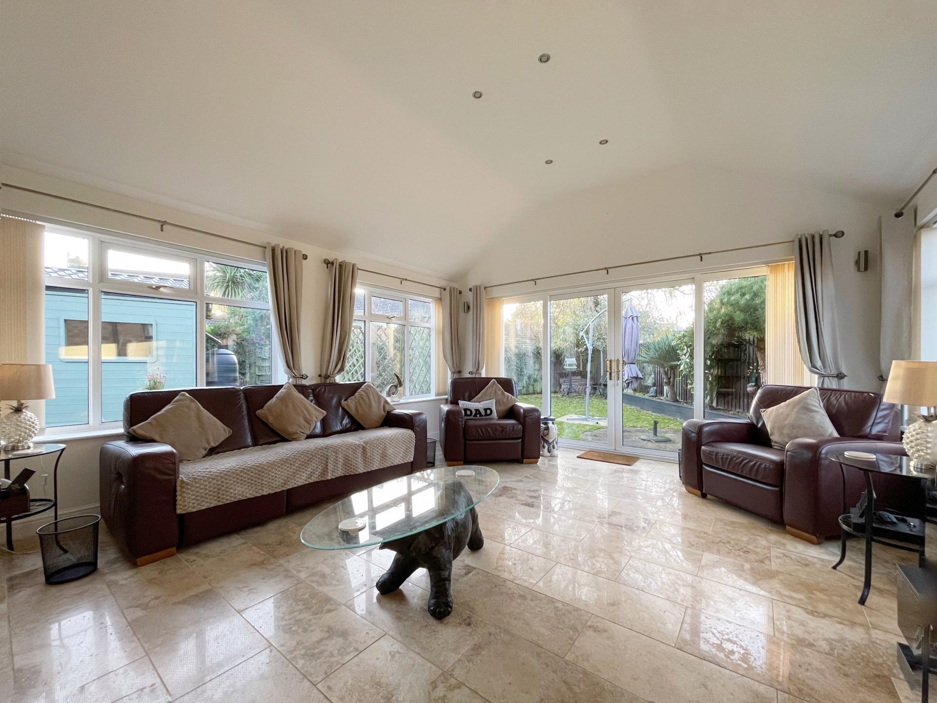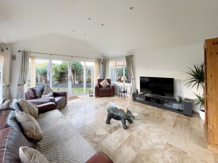 LOUNGE 17' 4" x 14' 9" (5.30m x 4.50m) Triple aspect with UPVC windows to the front and rear elevations, UPVC French doors with full height side panels to the side elevation, vaulted ceiling with recessed ceiling lights, marble style ceramic floor tiles, Fujitsu air conditioning unit.