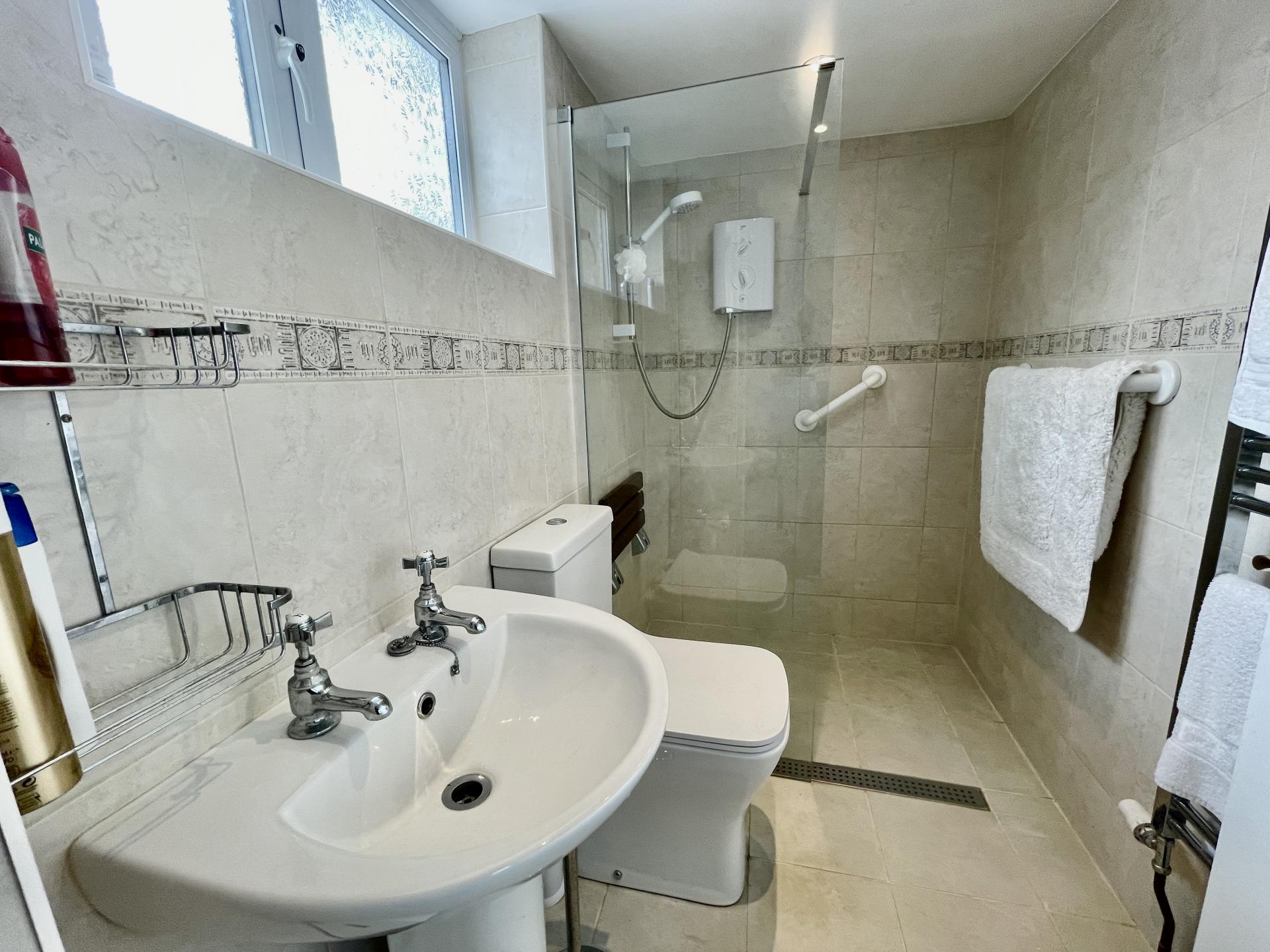 EN-SUITE SHOWER ROOM 5' 1" x 8' 2" (1.57m x 2.49m) Obscured UPVC double glazed window to the front elevation, skimmed ceiling, inset LED lighting, fully tiled walls, tiled floor, extractor fan, under floor heating, stainless steel heated towel rail, fitted with a three piece suite comprising low level WC, pedestal wash hand basin with taps and walk-in shower enclosure with fitted Mira Sport power shower.