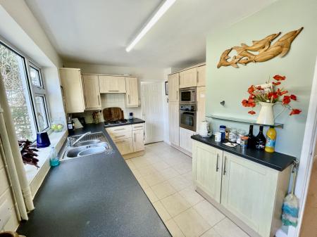 KITCHEN 10' 1" x 13' 4" (3.08m x 4.08m) UPVC double glazed window to the side elevation, UPVC double glazed door to the side elevation, skimmed ceiling, strip lighting, tiled flooring, fitted with a wide range of base and eye level units with work surfaces over, tiled splashbacks, inset one and a quarter bowl sink with mixer tap, further drawer units, integrated stainless steel gas hob, extractor hood over, pull out larder unit with shelving, integrated fridge, integrated eye level stainless steel fan assisted oven, integrated Bosch combination oven, plumbing and space for washing machine/dishwasher, further appliance space, door to Dining Area.