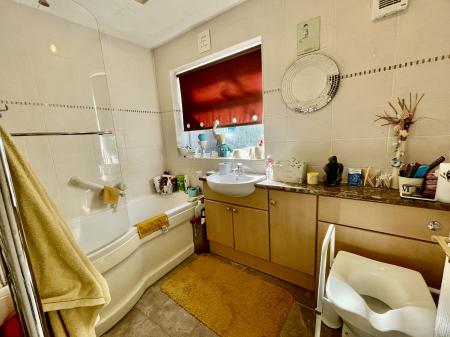 BATHROOM 5' 9" x 8' 4" (1.76m x 2.56m) P shaped bath with shower over and glazed screen, wash hand basin, low level WC with concealed cistern and push button flush, vanity storage cupboards, fully tiled walls, tiled floor, obscure glazed UPVC window, 2 ceiling lights, extractor fan, vertical radiator/towel rail.