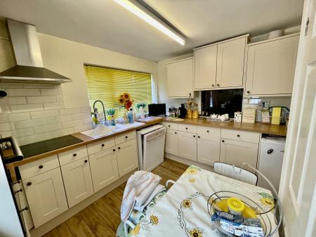 BREAKFAST KITCHEN 10' 7" x 11' 1" (3.25m x 3.39m) Tile effect laminate flooring, UPVC window to the rear elevation with Venetian blind, fluorescent strip light, range of cupboards and drawers beneath the woodgrain effect worktops with inset one and a quarter bowl resin sink unit with mono block mixer tap, built-in electric double oven, electric hob with multi speed cooker hood above, serving hatch, under counter appliance space, plumbing and space for dishwasher, cloaks cupboard, part glazed side door to: