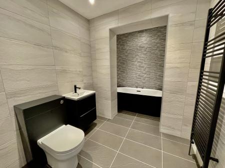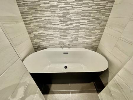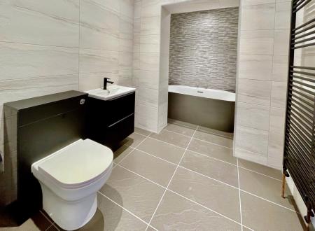 FAMILY BATHROOM 6' 9" x 10' 2" (2.08m x 3.10m) Skimmed ceiling, inset LED lighting, extractor fan, fully tiled walls, tiled floor, stainless steel graphite heated towel rail, fitted with a three piece suite comprising low level WC, wash hand basin with mixer tap fitted into vanity unit with storage below, oval bath with central mixer tap and shower attachment tap.