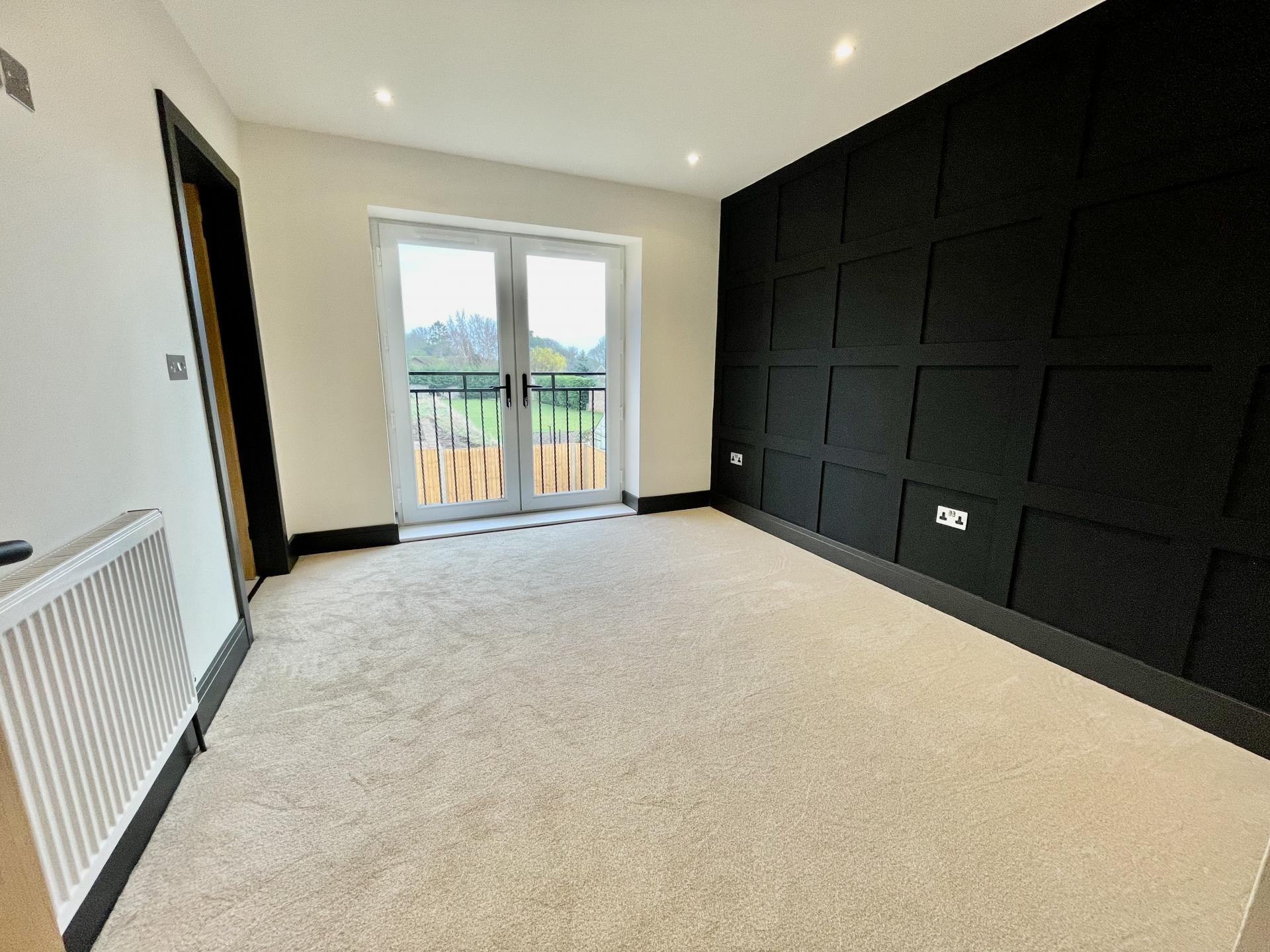 MASTER BEDROOM 12' 4" x 9' 11" (3.78m x 3.03m) UPVC double glazed French doors to the rear elevation leading on to BALCONY. Skimmed ceiling, inset LED lighting, TV point, radiator, wood panelling to one side wall, solid oak door into: