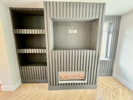 OPEN PLAN LIVING/DINING/KITCHEN 24' 7" x 16' 3" (7.50m x 4.96m) at the widest point UPVC double glazed window to the side elevation, skimmed ceiling, centre light point, double radiator, TV point, fitted recessed log effect fire, built-in recessed shelving, built-in recessed cupboard for TV, oak effect laminate click flooring, square arch into: