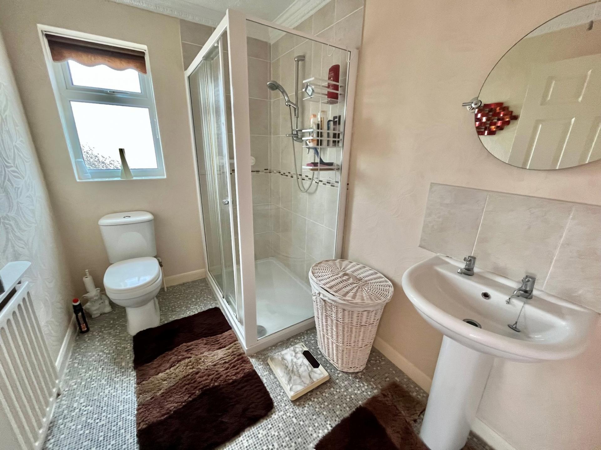 EN-SUITE SHOWER ROOM 10' 3" x 5' 10" (3.13m x 1.79m) maximum Large shower cabinet with fitted shower and tiled surround, low level WC, pedestal wash hand basin, radiator, coved cornice, ceiling light.