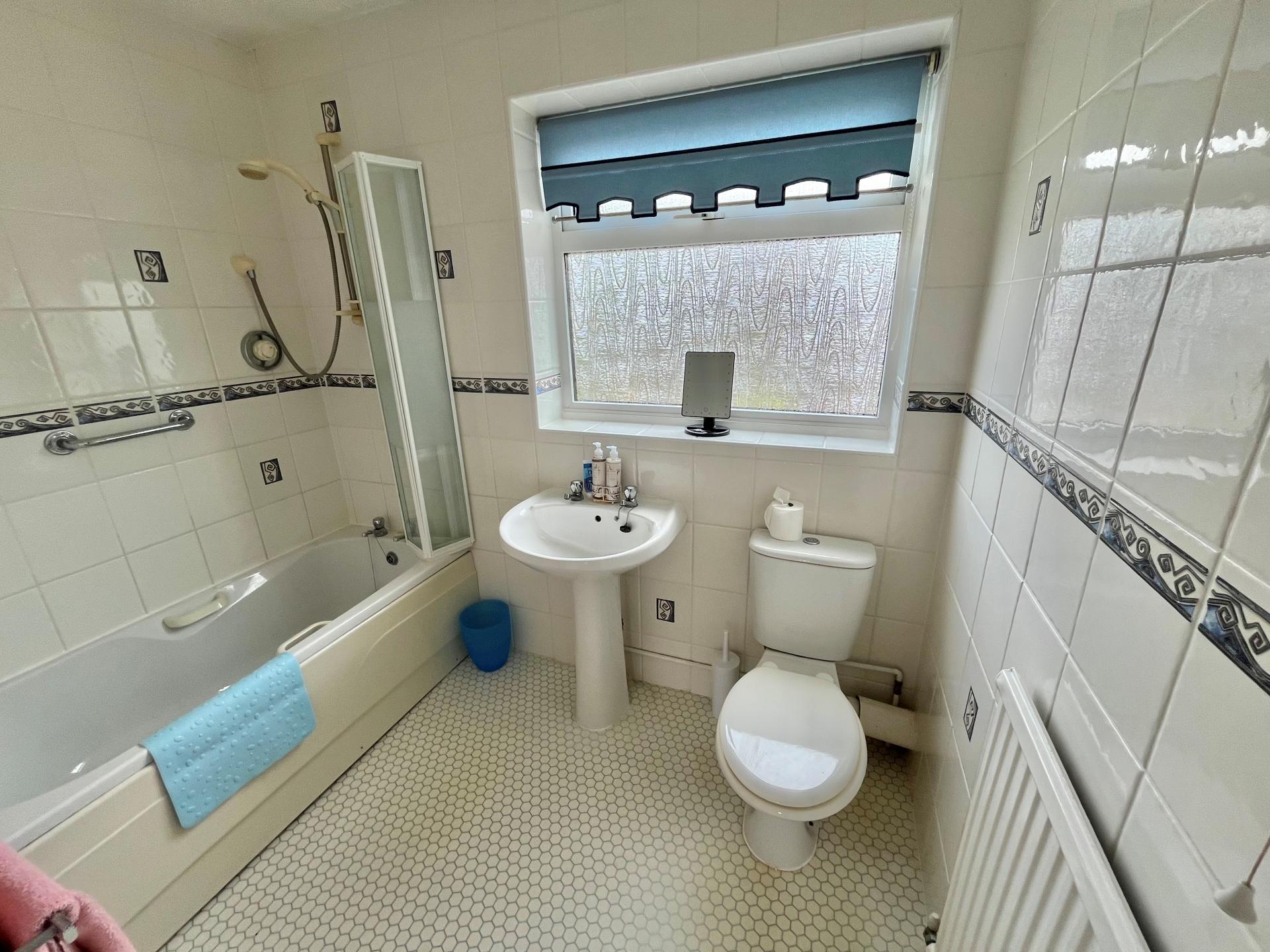 BATHROOM 7' 9" x 5' 8" (2.38m x 1.73m) Fitted three piece white suite comprising panelled bath with hot and cold taps, hand grips and Mira shower with folding screen, pedestal wash hand basin, low level WC, fully tiled walls, radiator, obscure glazed UPVC window, ceiling light.