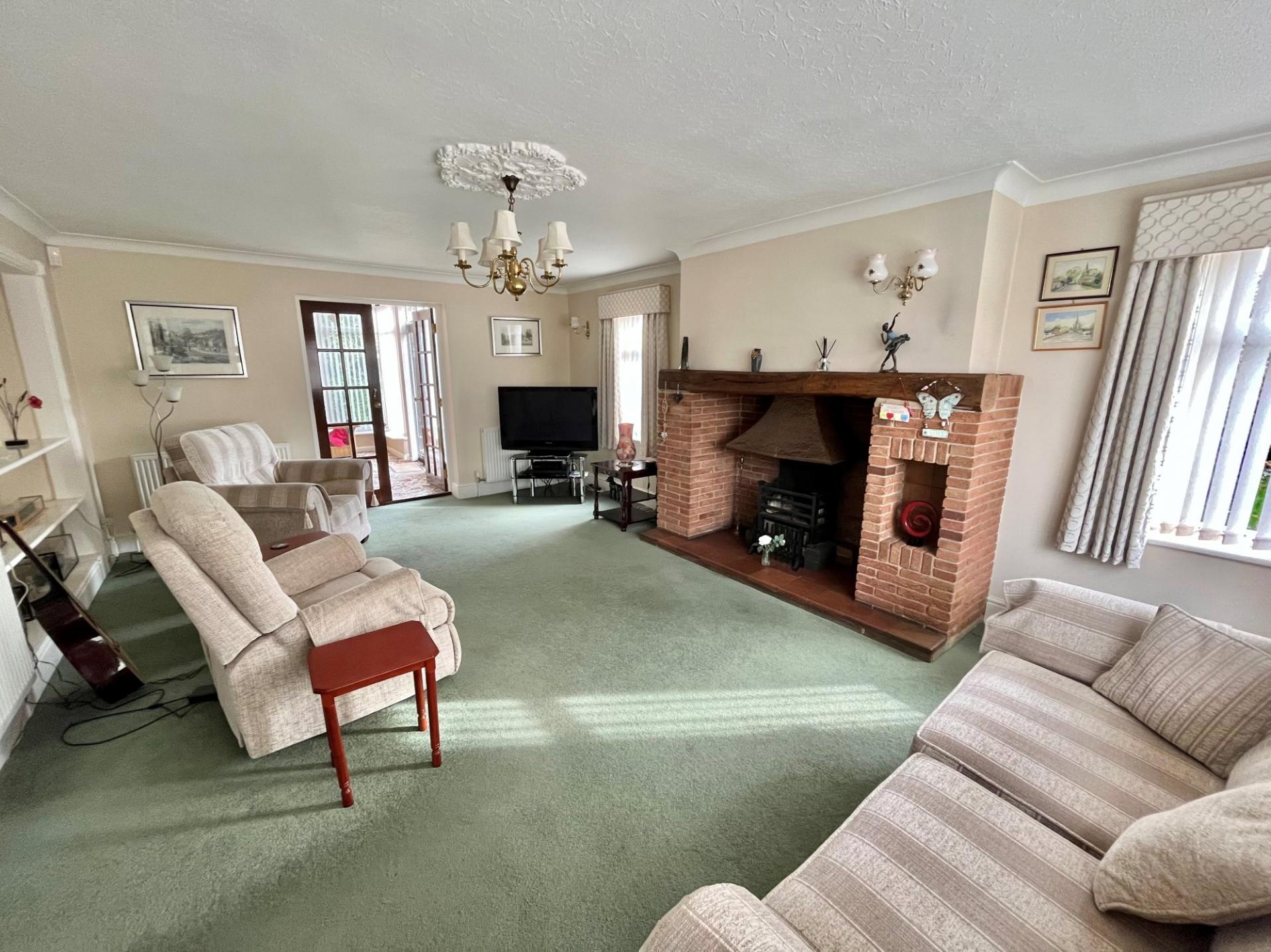 SITTING ROOM 13' 9" x 20' 6" (4.20m x 6.25m) Dual aspect with UPVC windows to the front and side elevations, Inglenook style fireplace with raised open grate, decorative timber mantle and tiled hearth, skirting radiators, recessed shelved display area, 3 radiators, 3 wall lights, pair of multi pane glazed doors opening into: