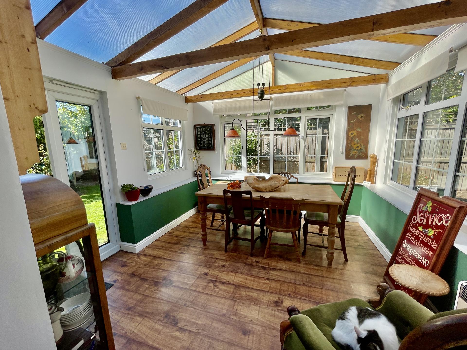 DINING ROOM 11' 5" x 11' 4" (3.49m x 3.46m) Brick construction with UPVC double glazed windows to both sides and to the rear elevation, UPVC double glazed French doors to the side elevation, vaulted ceiling with beams with polycarbonate roof and centre light point, wall mounted heater, Walnut laminate flooring.