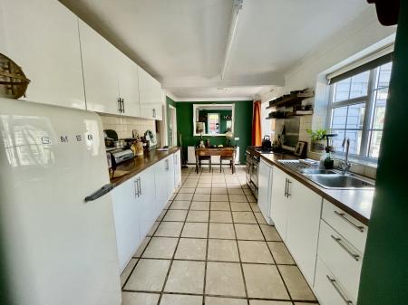 KITCHEN 8' 11" x 17' 5" (2.73m x 5.33m) UPVC double glazed window to the rear elevation, coved and textured ceiling, centre strip light, tiled flooring, radiator, fitted with a wide range of base, eye level and drawer units, work surfaces over, tiled splashbacks, inset stainless steel one and a quarter bowl sink with mixer tap, space for fridge freezer, plumbing and space for dishwasher, fitted Range style cooker with 5 ring gas hob, plate warmer and electric double fan assisted oven. Square arch into Dining Room and opening into Utility Room.