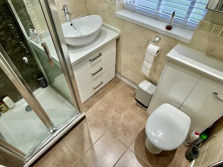 SHOWER ROOM : UPVC obscured double glazed window to the rear, fully tiled shower cubicle with an electric mixer shower over, vanity washbasin with a mixer tap over and storage drawers beneath with a work surface over, W.C, wall mounted heated towel rail, tiled splash-back’s, tiled floor and inset spotlights.