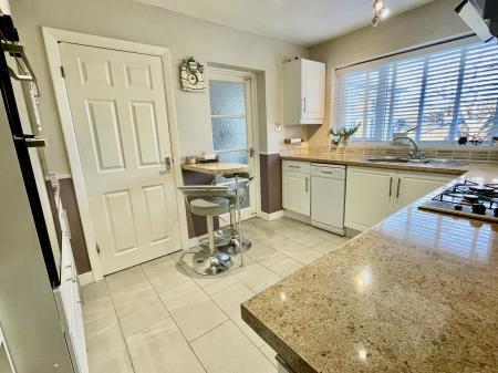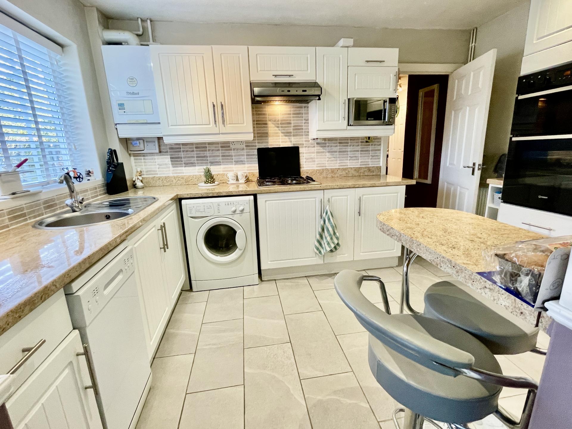 KITCHEN/BREAKFAST : 3.68m x 2.59m (12'1" x 8'6") UPVC double glazed window to the rear, base and eye level units with a work surface over, sink and drainer with a mixer tap over, integrated electric oven and grill with a half sized electric oven and grill above, a four burner gas hob with an extractor hood over, space and plumbing for a washing machine, space and plumbing for a slimline dishwasher, tiled splash-back’s, tiled floor, inset spotlights.