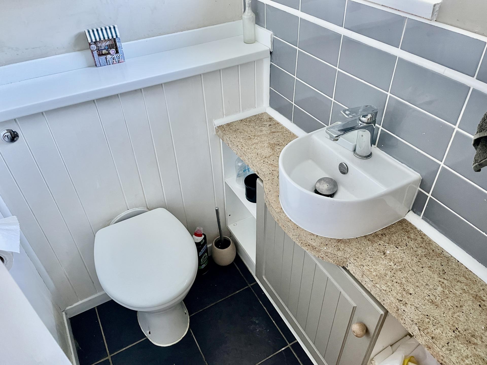 CLOAKROOM : UPVC obscured double glazed window to the side, W.C with a push button flush, vanity washbasin with a mixer tap over and storage cupboards beneath with inset shelving and a work surface over, tiled splash-back’s, half height tongue and groove walls, tiled floor and a storage cupboard.