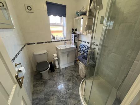 EN-SUITE SHOWER ROOM 7' 1" x 5' 10" (2.17m x 1.80m) Corner shower cabinet with overhead sprinkler, low level WC, hand basin with mixer tap and store cupboard beneath, fully tiled walls, tiled floor, coved and textured ceiling, extractor fan, ceiling light, obscure glazed UPVC window.