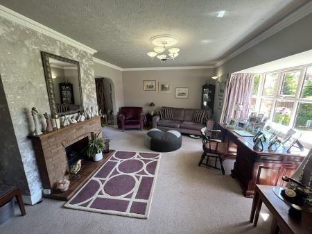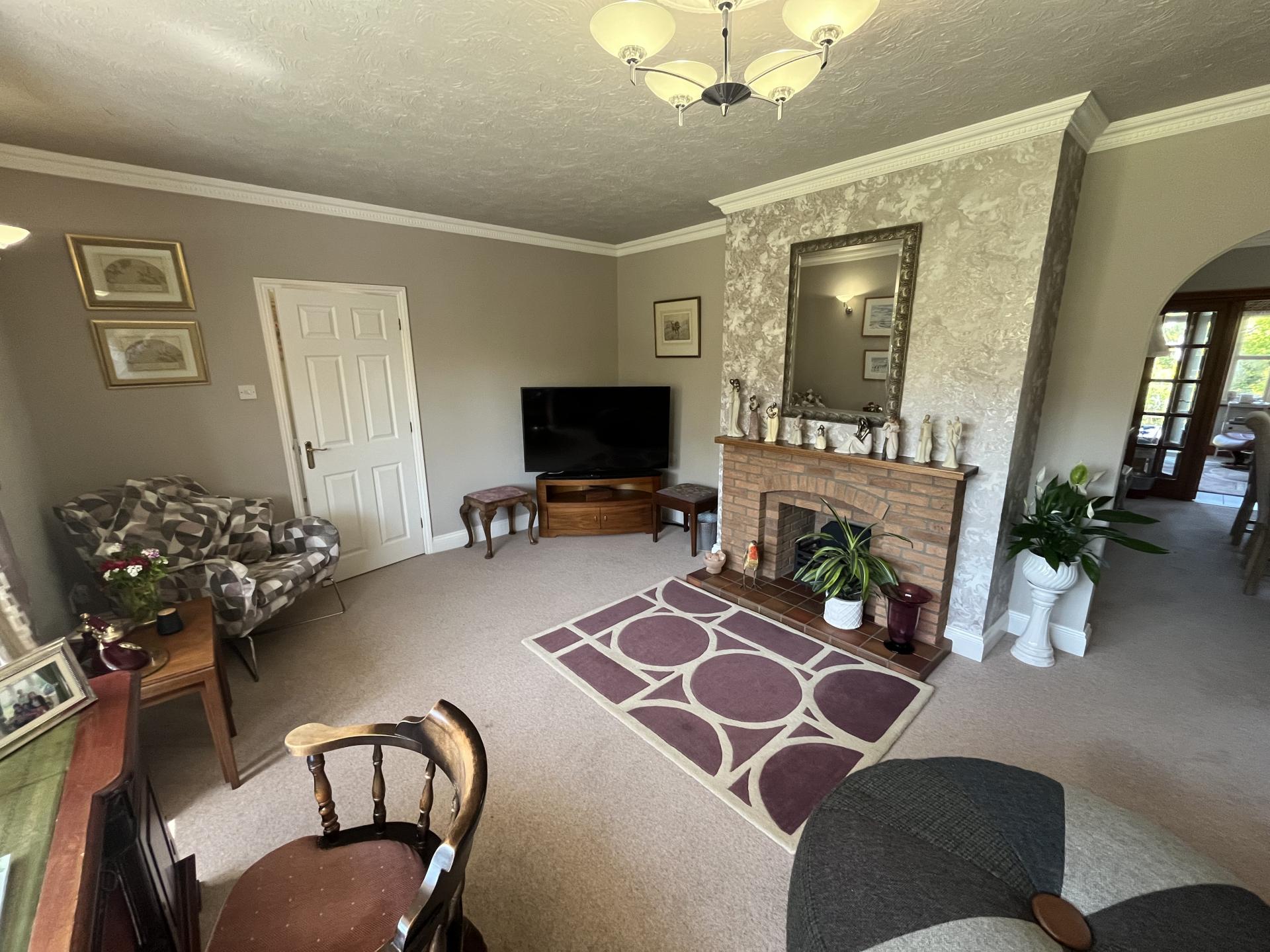 LOUNGE 20' 0" x 12' 10" (6.12m x 3.93m) plus large walk-in bay window to the front elevation. Decorative coved cornice, decorative ceiling rose with pendant light fitment, textured ceiling, 2 wall lights, brick fireplace with raised tiled hearth, arch to: