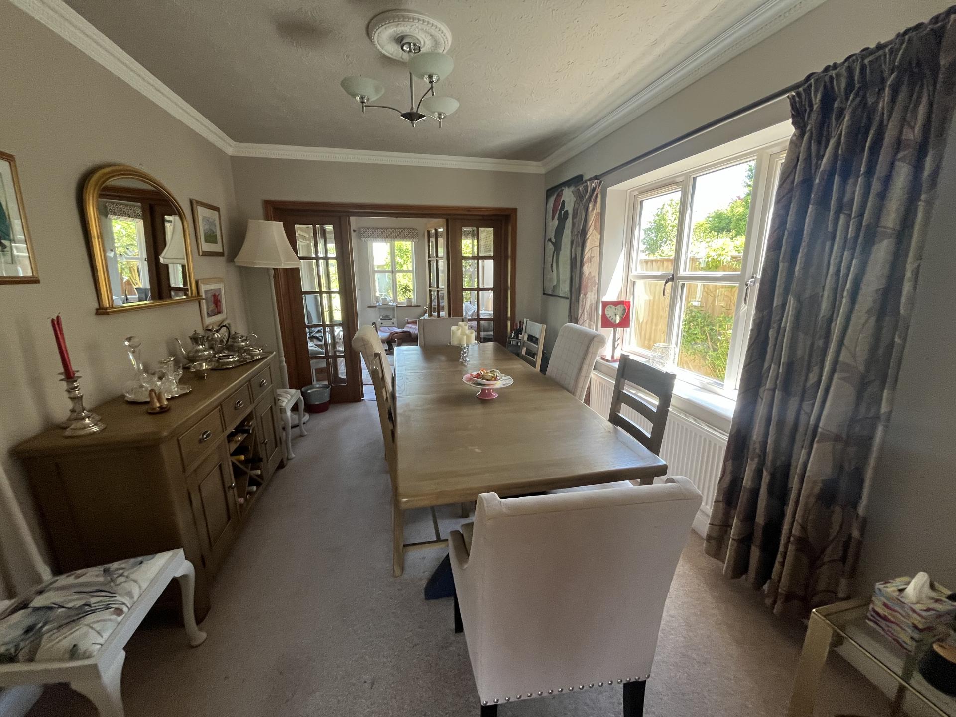 DINING ROOM 13' 0" x 9' 8" (3.97m x 2.96m) UPVC window to the side elevation, fitted carpet, radiator, decorative coved cornice, decorative ceiling rose with pendant light fitment, textured ceiling, multi pane glazed doors with bevelled glass panels to: