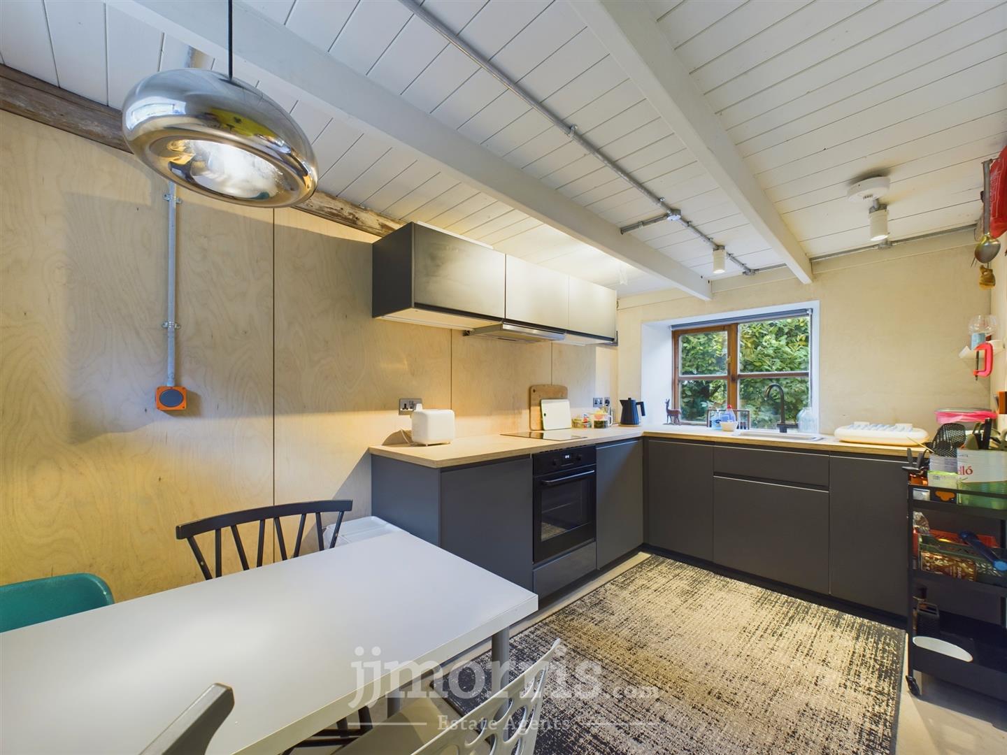 Kitchen - Having a range of wall and base units with complimentary worktop surfaces, stainless steel sink with mixer tap over, integrated washer/dryer, integrated fridge, built-in electric oven with induction hob and extractor fan over, space for dining table, wooden window, exposed beams.