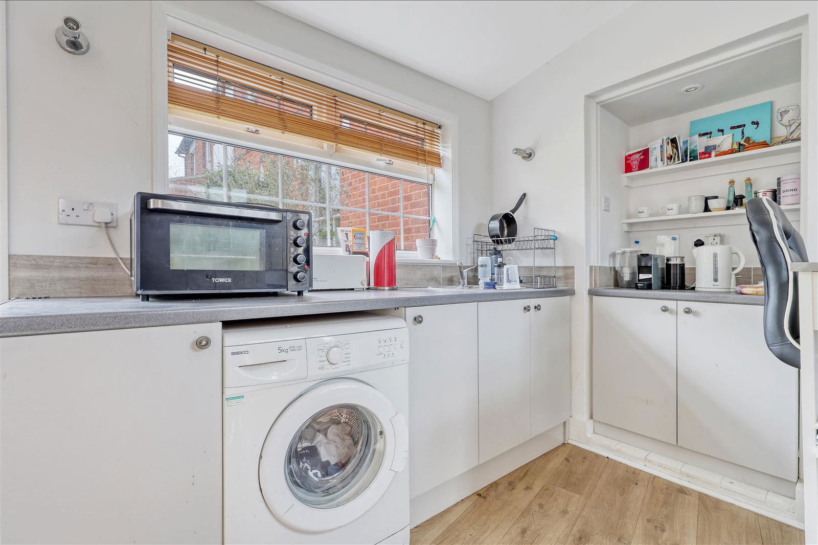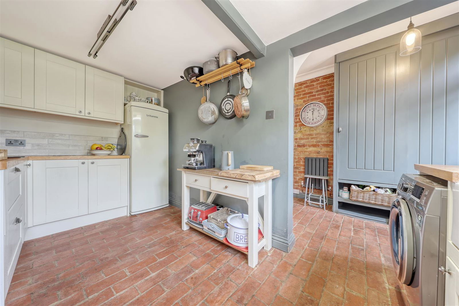 Fitted in a traditional cottage style with cream coloured wall, base and display units complemented by wood block work surfaces. Inset Butler style sink. Tiled splash-backs. Wide recess for range cooker. Spaces for washing machine, dishwasher and tall fridge freezer. Concealed, wall mounted gas fired boiler. Original brick floor. Window to rear.