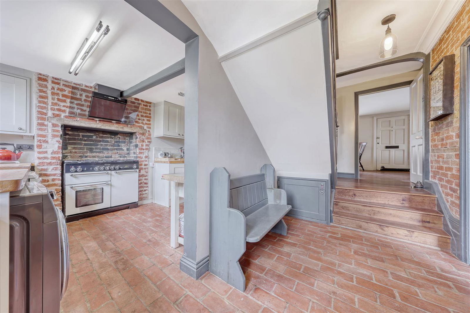Exposed ceiling timber and brick walls. Stairs rising to first floor. Unser stairs cupboard. Door to cellar. Steps down to lobby area with original brick floor. Radiator. Storage cupboard and shelving. Door to dining room. Part open plan to kitchen, providing extra storage. Door to garden.