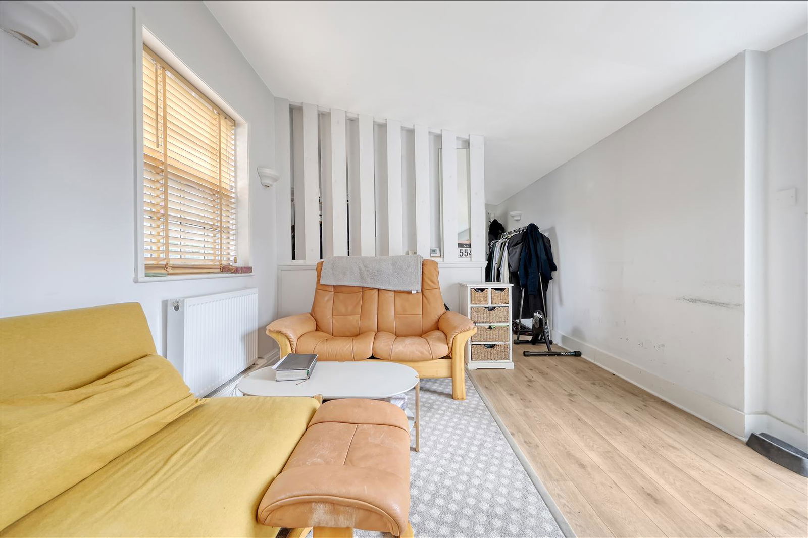 Sash window to rear. Column radiator. Exposed wood floor. Attractive cast iron fireplace (decorative only)