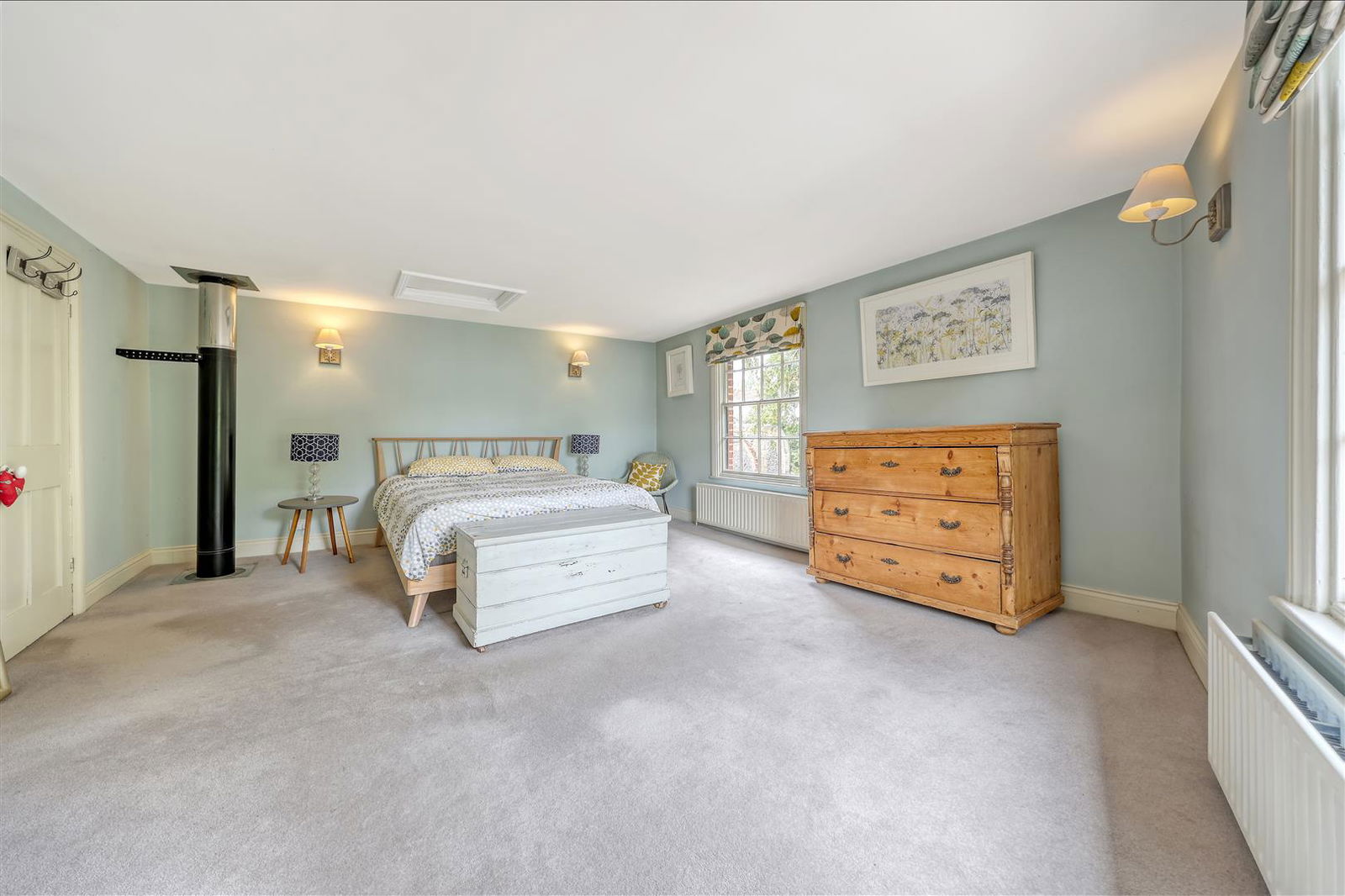 Beautiful dual aspect room with twin sash windows to front aspect and another to the side, all fitted with bespoke shutter blinds. An attractive, contemporary wood burning stove complements and contrasts with the exposed brickwork and solid oak floor. Three column radiators. Wall lights. Door to inner hall and door to the study.