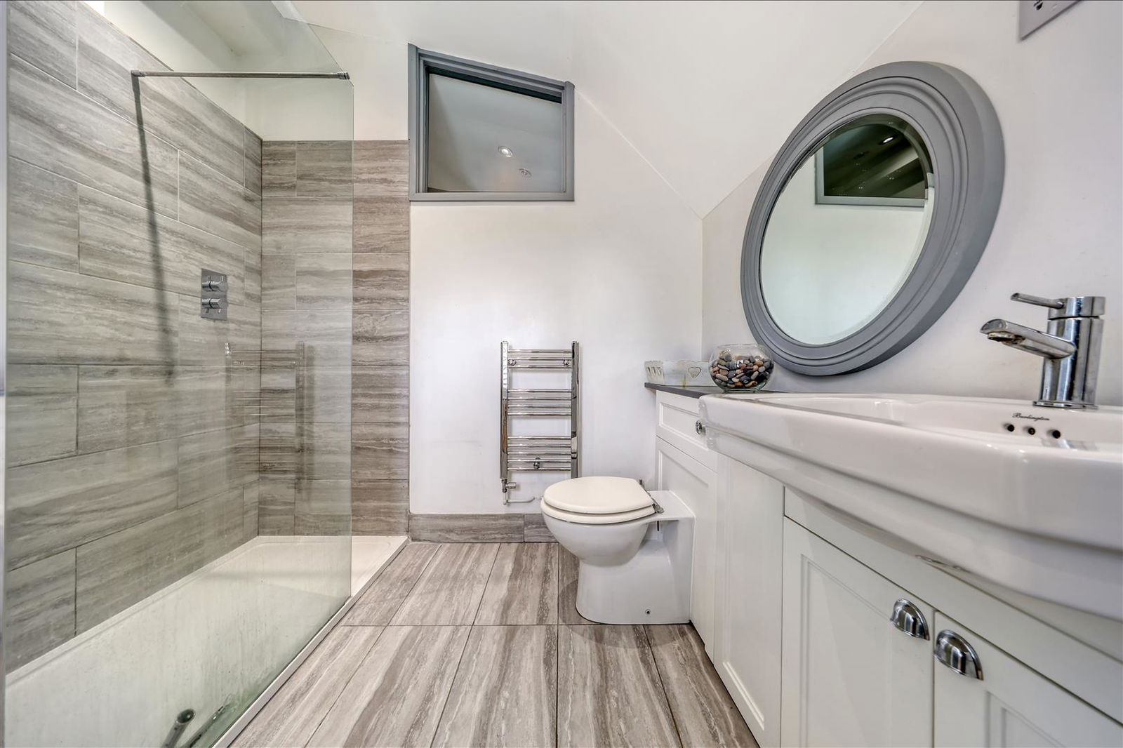 Fitted with a white suite: Low level w.c. with concealed cistern. Vanity wash hand basin set in countertop with storage below. Large walk in shower with glazed screen. Part vaulted ceiling. Complementary tiling to walls and floor. Deep recessed airing cupboard. Window to rear.