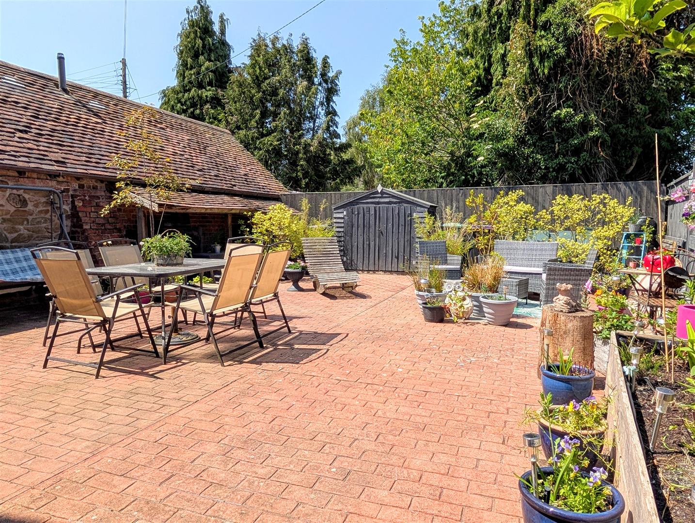Enclosed courtyard garden paved for ease of maintenance. Garden store shed.