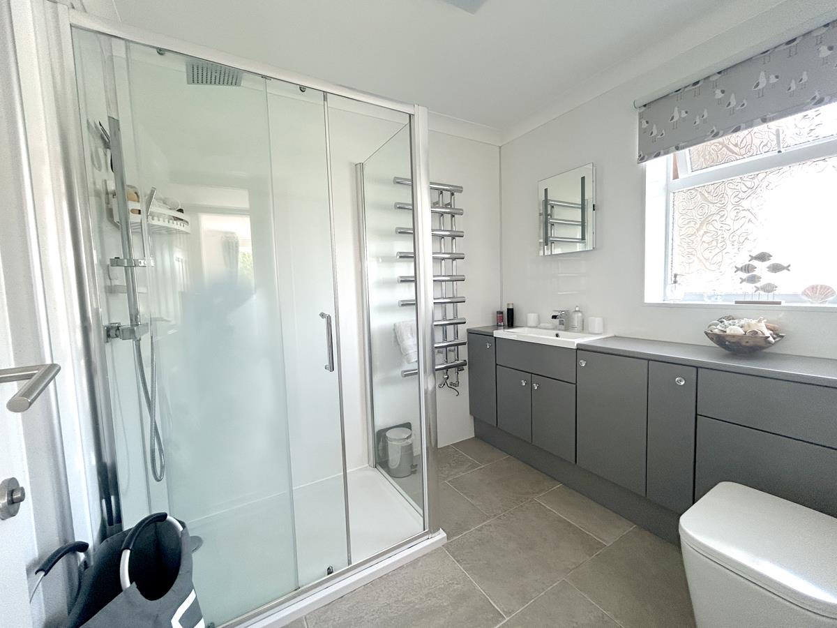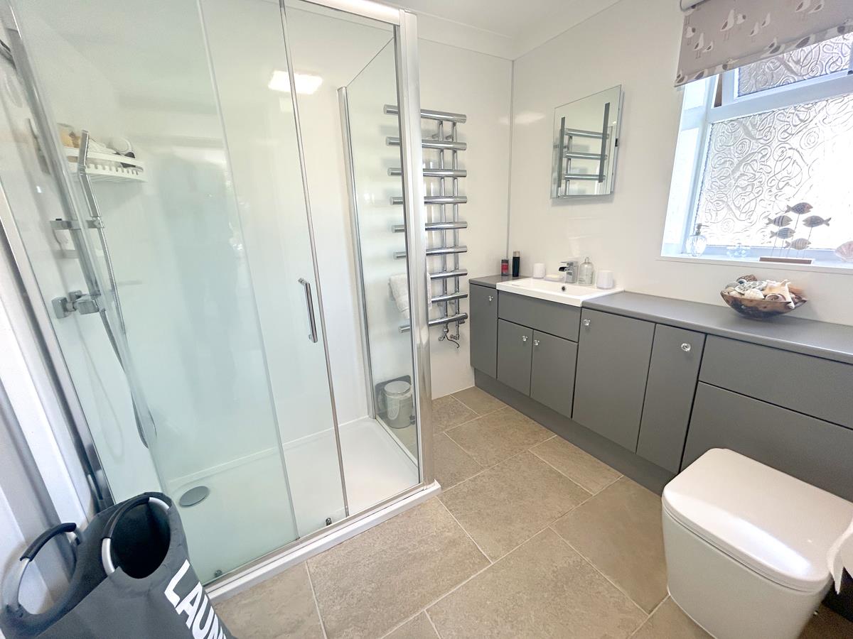 Shower Room - Beautifully appointed, the bathroom features a generous glazed walk-in shower cubicle with a luxurious rain-style drencher head and additional handheld shower, complemented by easy-clean splashbacks. A wash hand basin is set within a stylish vanity unit with storage beneath, alongside further fitted storage with shelving above. There is a concealed cistern dual flush W.C., while the room is finished with attractive tiling to the floor, easy-clean wall surfaces, and an obscure glazed window to the side aspect providing natural light and privacy.