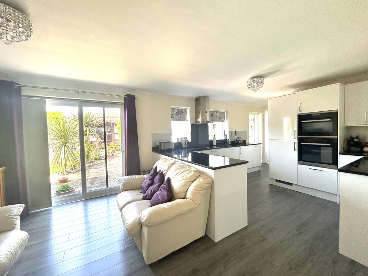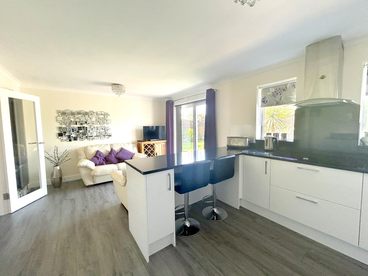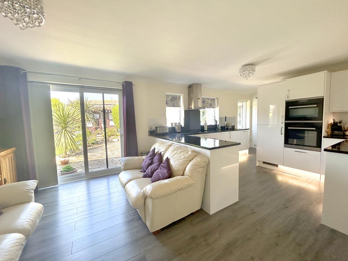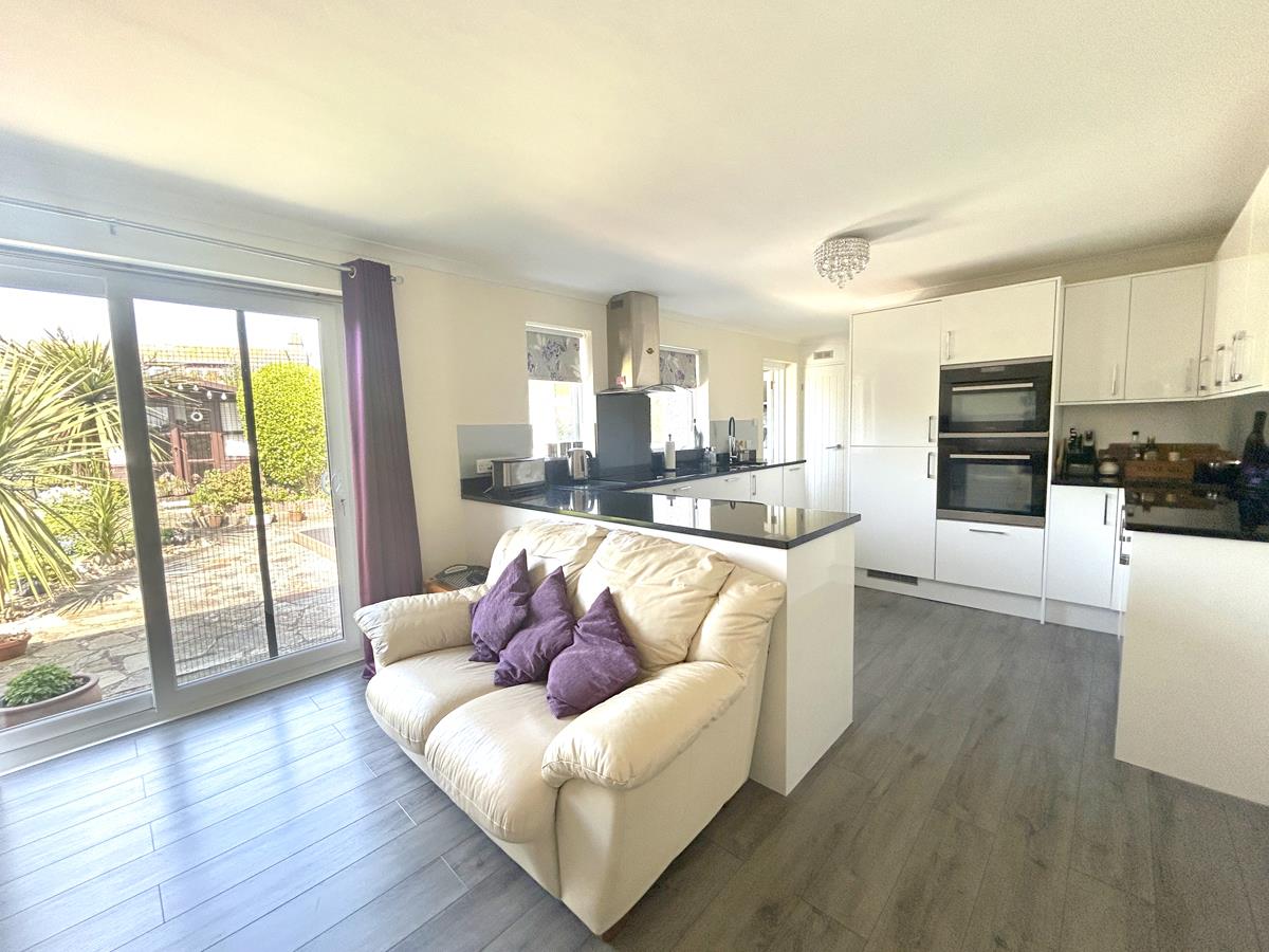 A full suite of integrated appliances includes an oven, combination microwave oven, dishwasher, and fridge freezer. The space is further enhanced by wood-effect flooring and an abundance of natural light, with windows to both the front and rear aspects with matching granite sills, along with a glazed sliding patio door and matching side panel that open onto the garden.